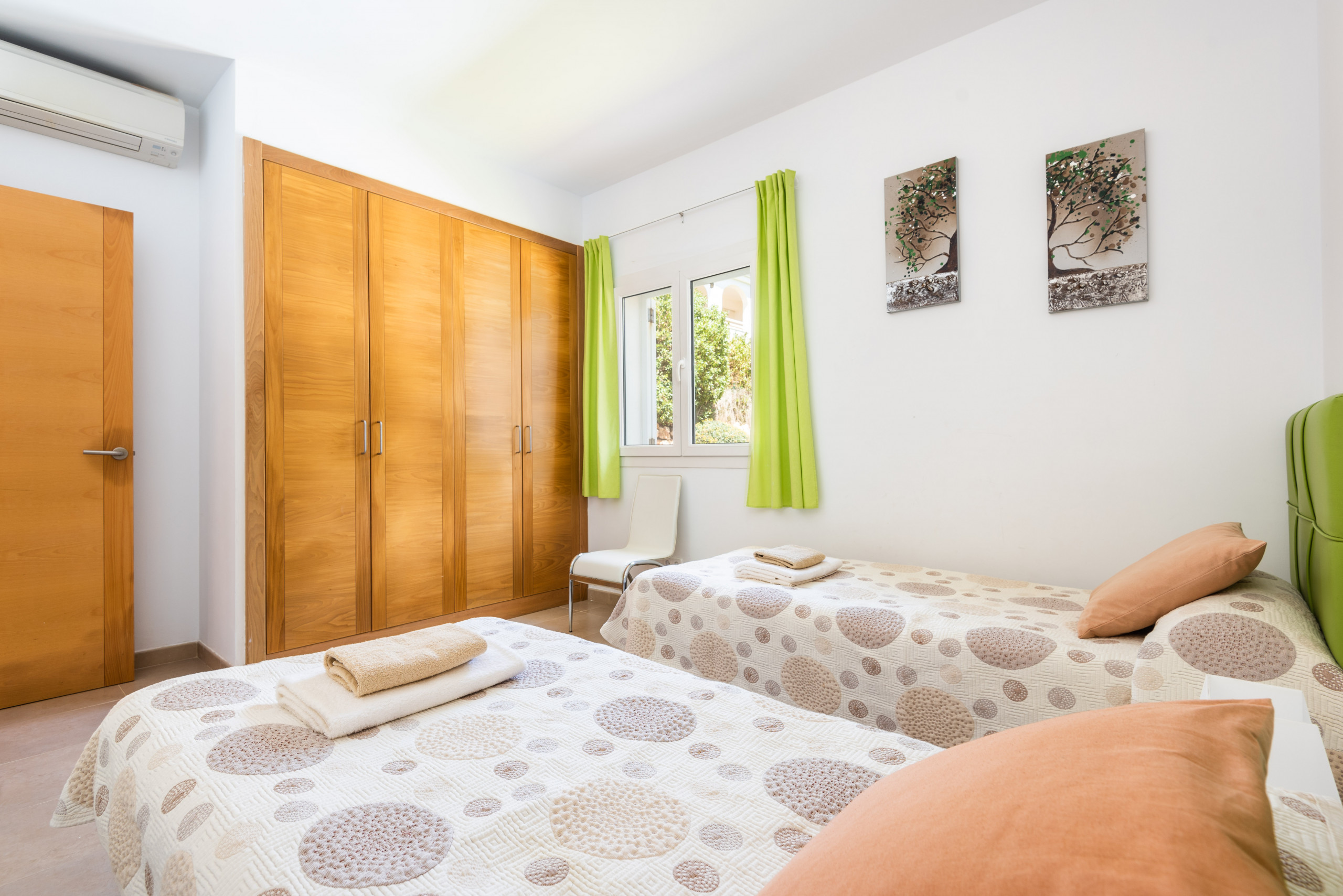 The villa has a surface area of 203 m² and features three double bedrooms with air conditioning: two with single beds and one with a double bed, which includes an en-suite bathroom. In addition, there is a second full bathroom with a bathtub.