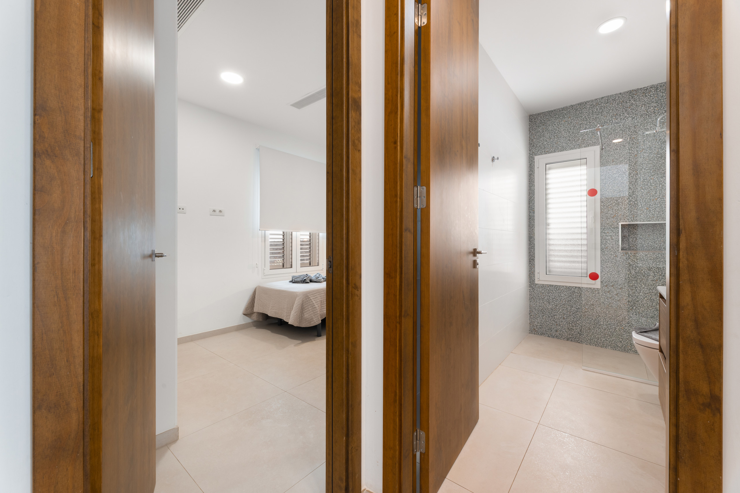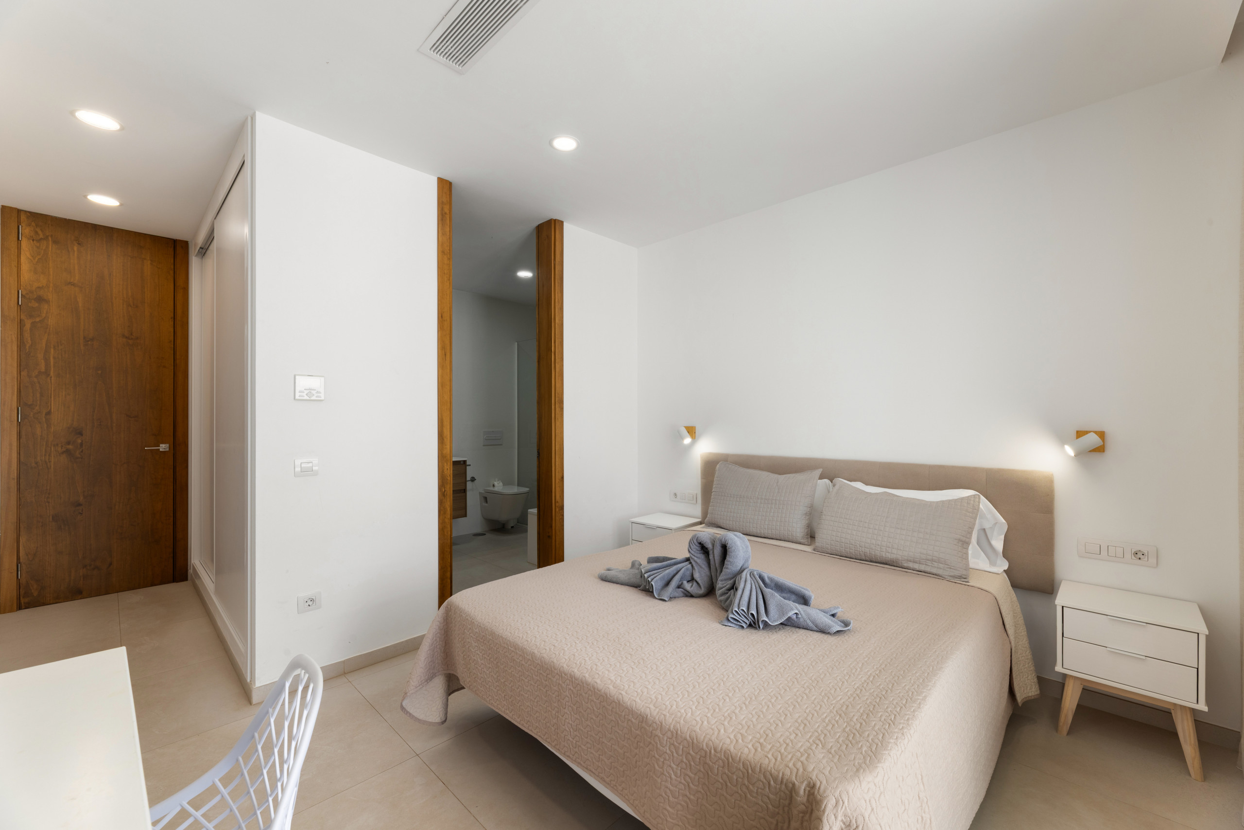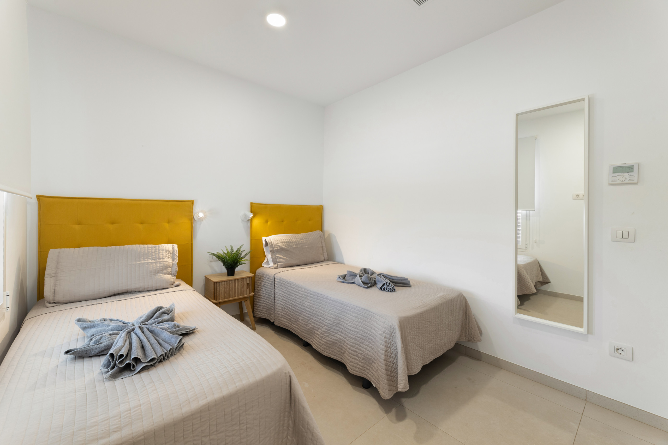 Villa Clara is a 3-bedroom accommodation perfect for a family holiday and to enjoy its outdoor areas. Beautiful outdoor area with various spaces to enjoy in different environments. Relaxation area with sun loungers and parasol, covered terrace with table and chairs, barbecue area and private pool surrounded by artificial grass. In addition to another outdoor dining area. The house is decorated with great taste and elegance. Inside, Villa Clara is distributed over two floors: On the ground floor we find: Beautiful, very bright kitchen with office, well-equipped with appliances and all its equipment. Living room with air conditioning with external access through a large window, wifi, smart tv. Bathroom with shared shower. On the upper floor are the bedrooms. The villa has 3 bedrooms, two of them with double beds and a bedroom with two single beds, as well as a bathroom with shower. All bedrooms have air conditioning. There is a safe.