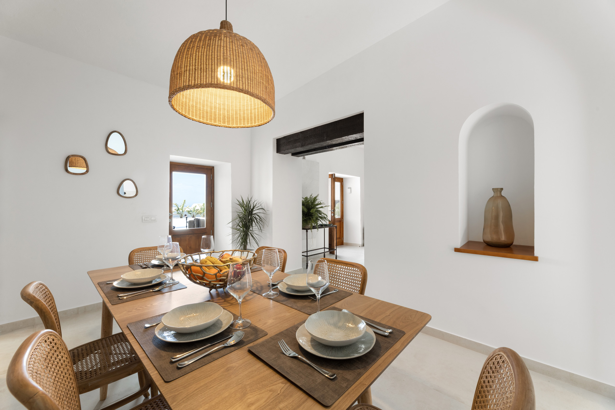 The living room has a comfortable sofa, flat-screen TV and access to the outdoor terrace with table and chairs, swimming pool and sun loungers to relax or read a book leisurely.