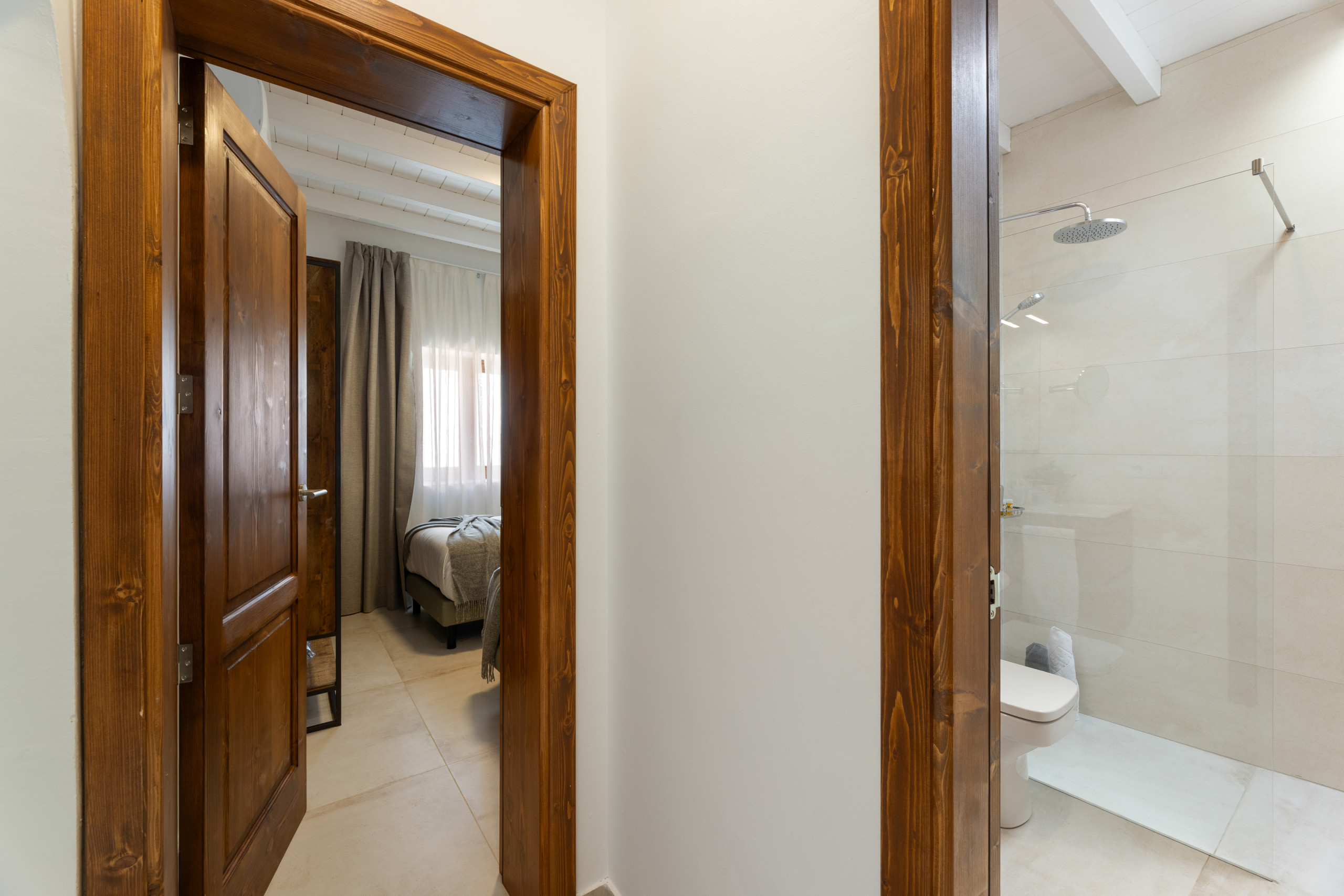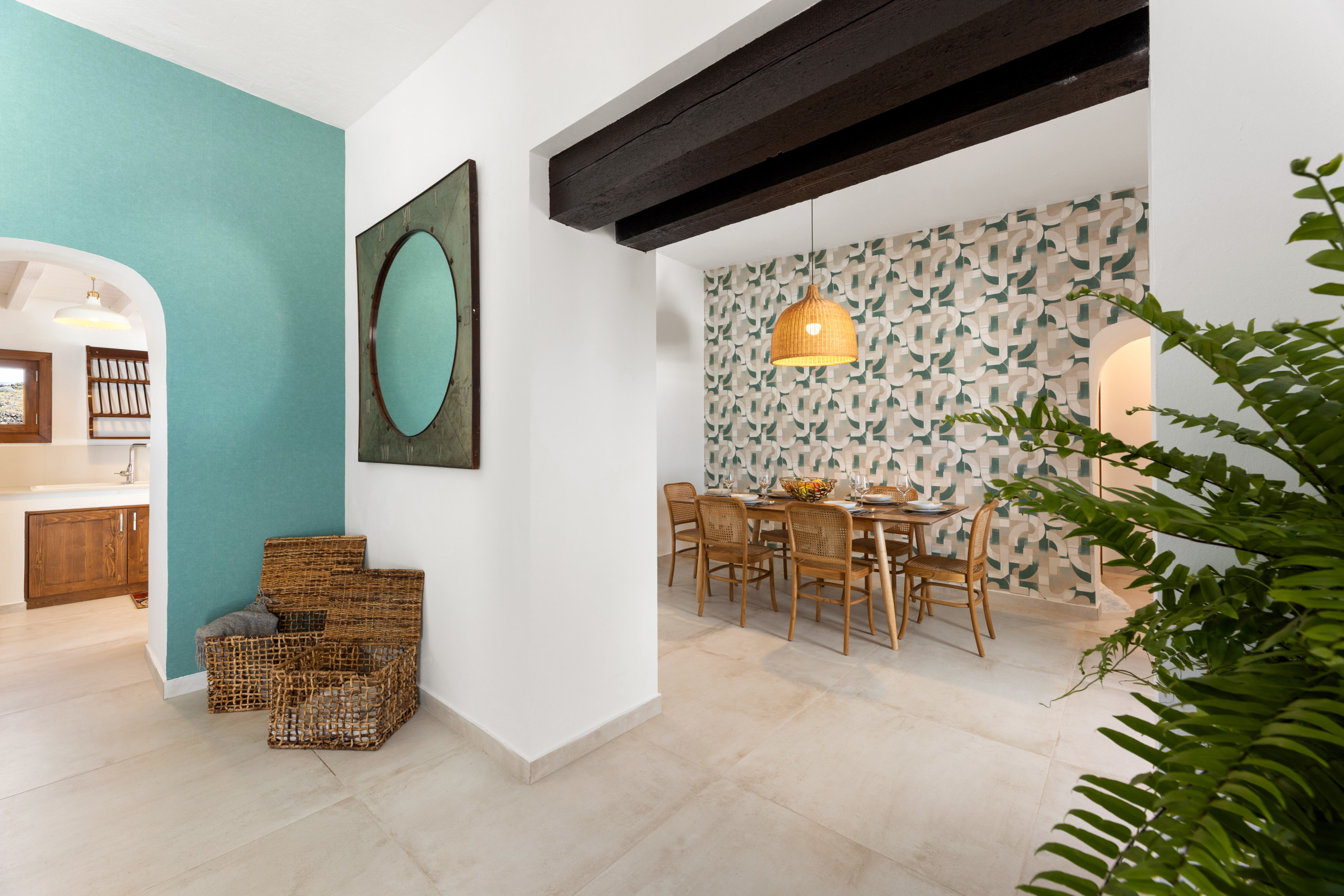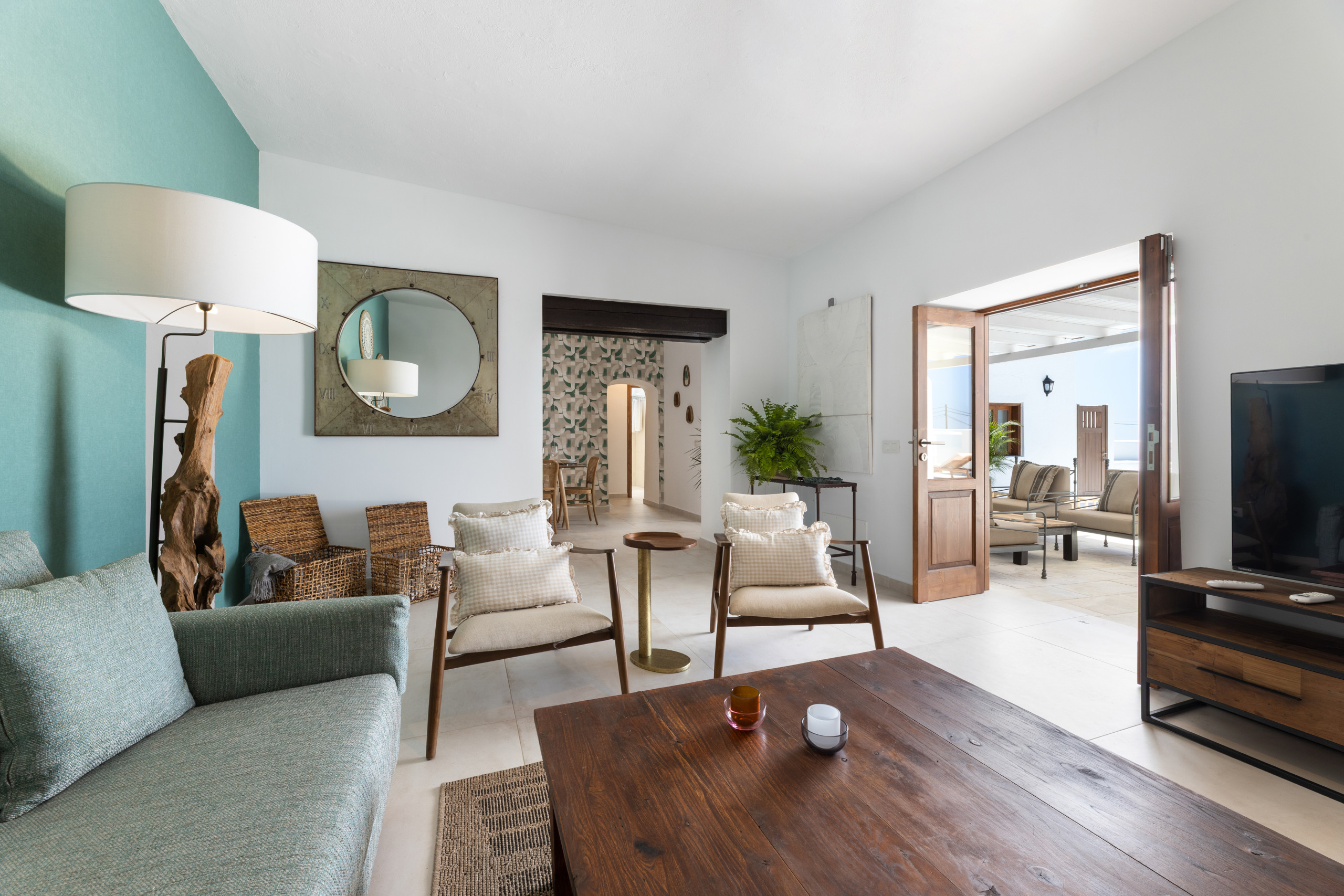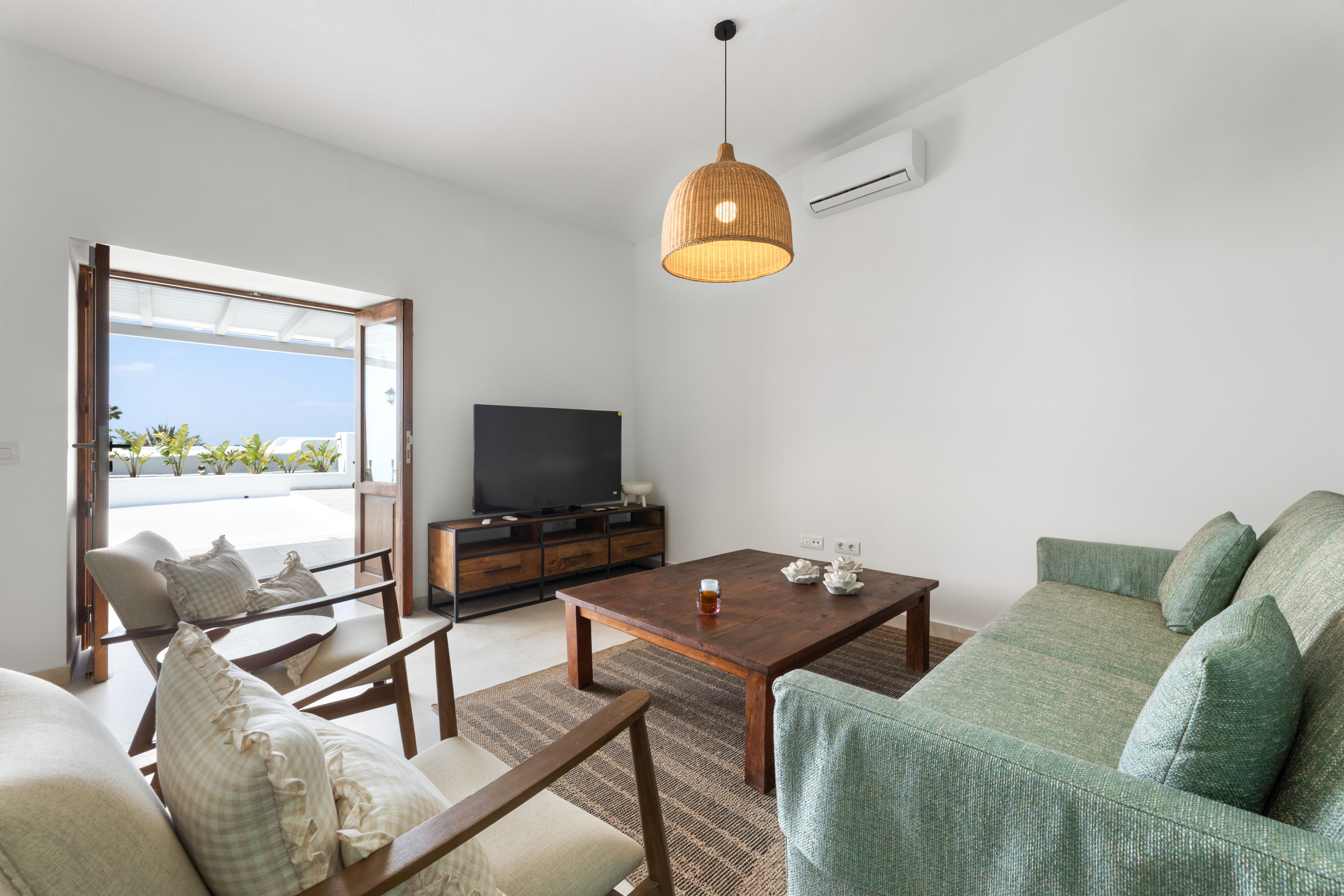 The living room has a comfortable sofa, flat-screen TV and access to the outdoor terrace with table and chairs, swimming pool and sun loungers to lie in the sun or read a book relaxedly.