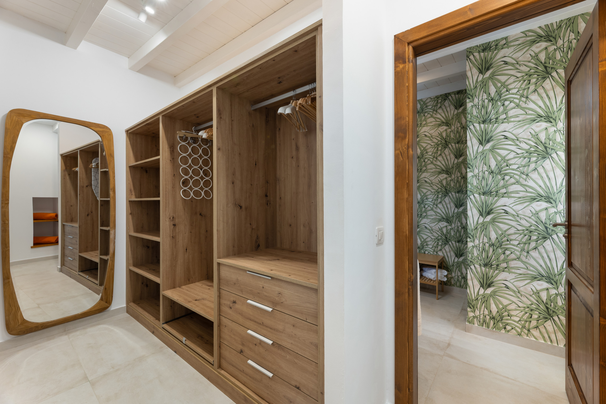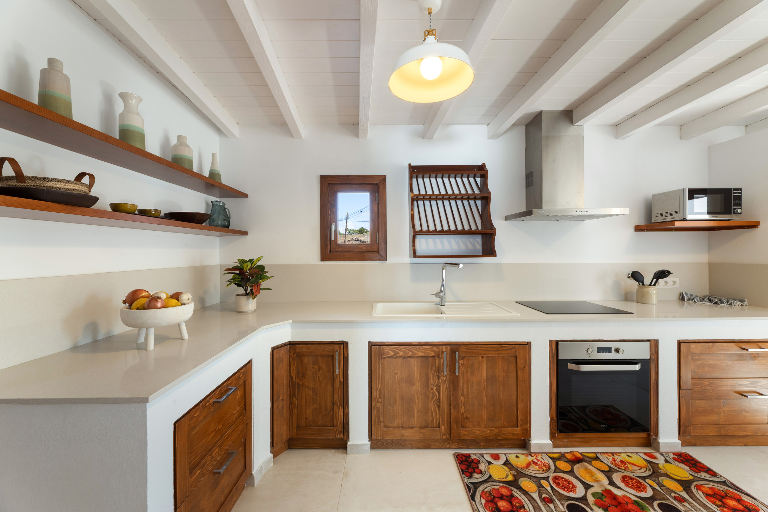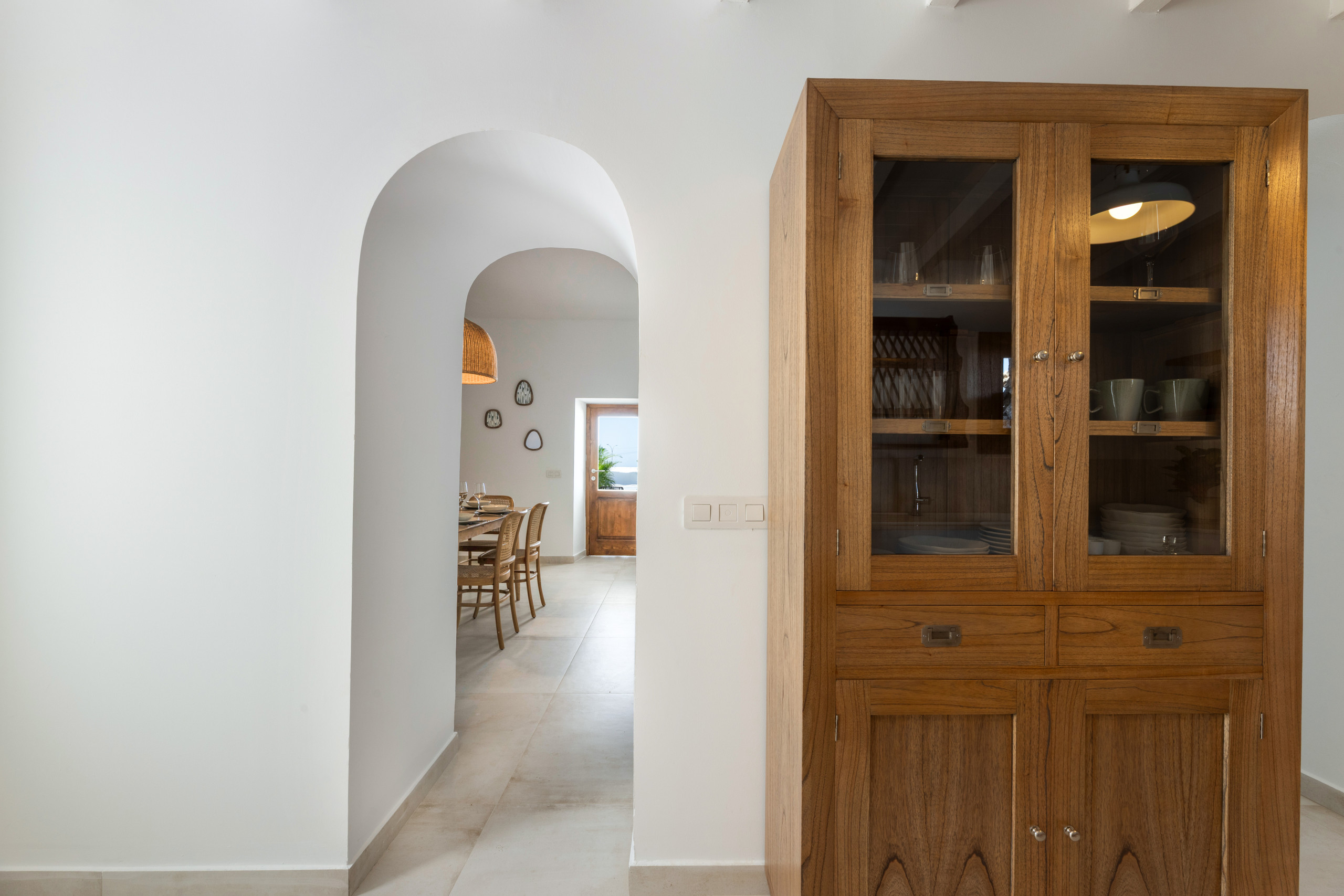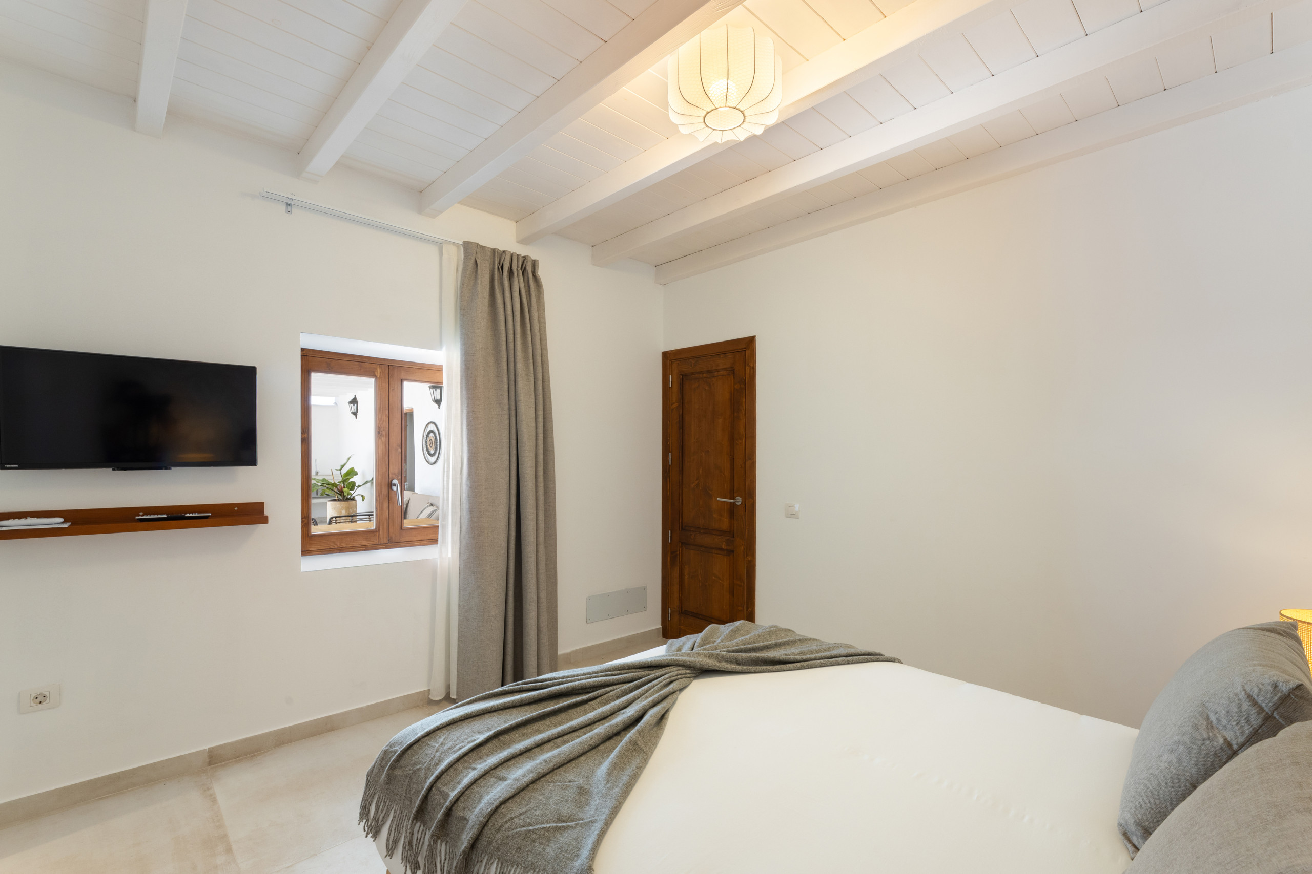 The living room has a comfortable sofa, flat-screen TV and access to the outdoor terrace with table and chairs, swimming pool and sun loungers to lie in the sun or read a book relaxedly.