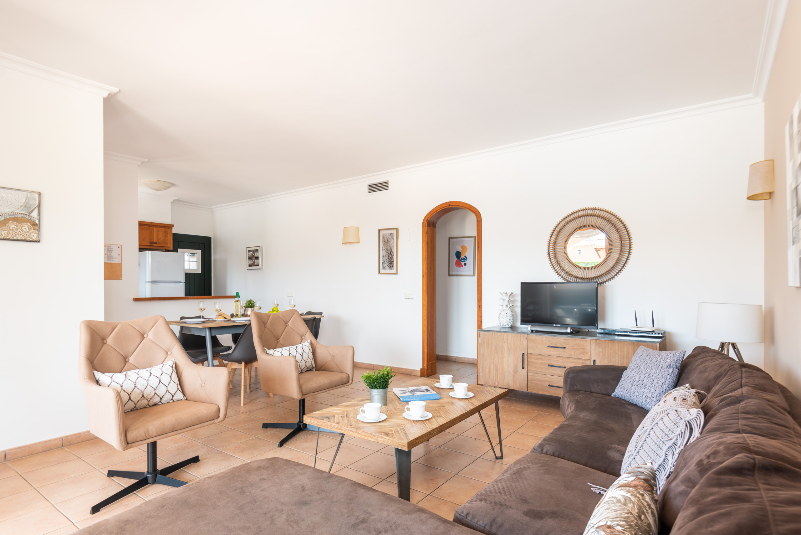 and electric water heater. Living room: Comfortable seating, Smart TV, music system, dining