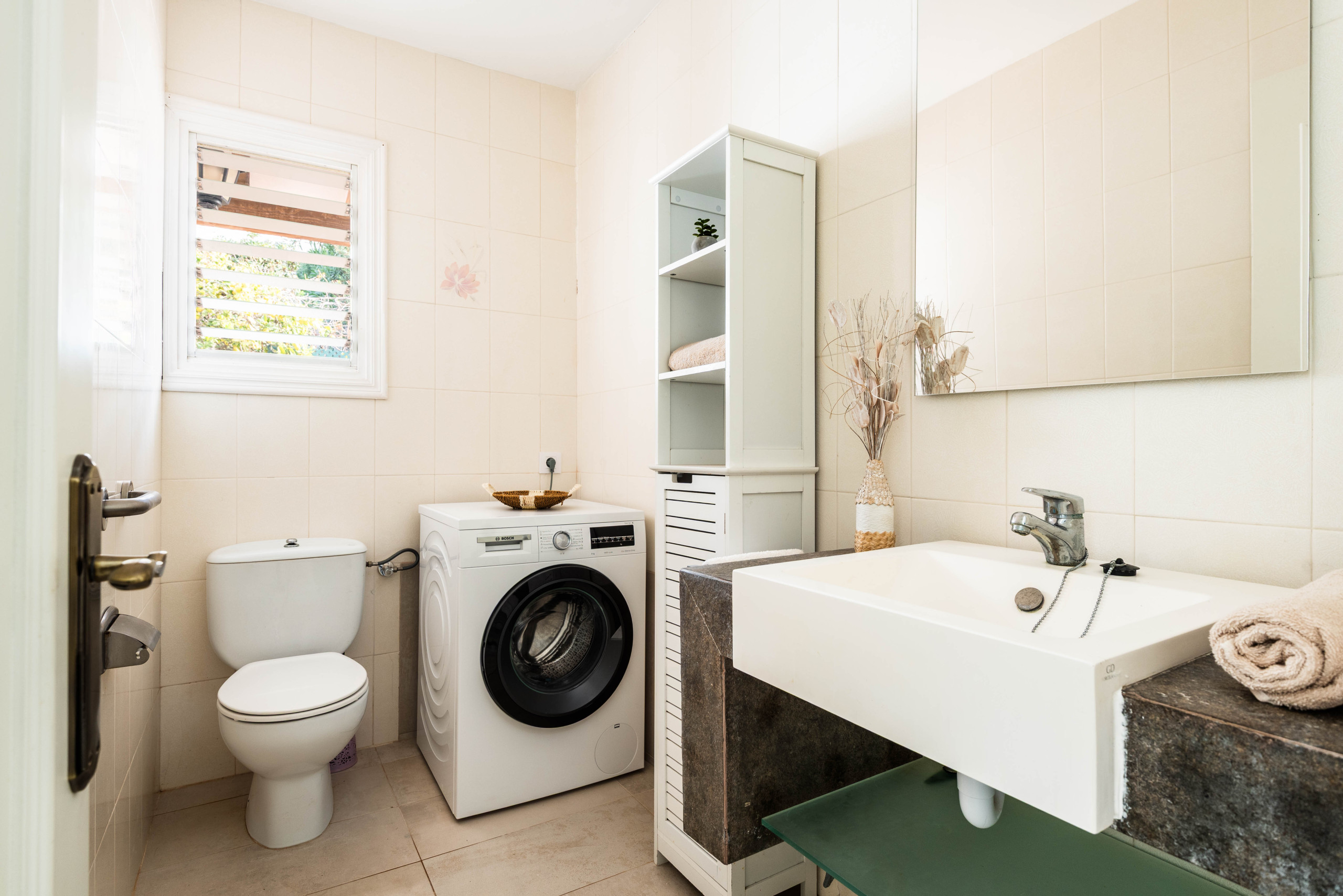 The spacious open-plan area that integrates living room, dining room and kitchen creates a bright and welcoming atmosphere. The living room has comfortable sofas, Smart TV and music system, and opens through large doors to the outdoor dining area, garden and magnificent private pool, achieving a perfect connection between the interior and exterior. The open, modern and fully equipped kitchen has an oven, ceramic hob, microwave, dishwasher and fridge with freezer. The property is completed with an independent utility room that has a washing machine and electric water heater.