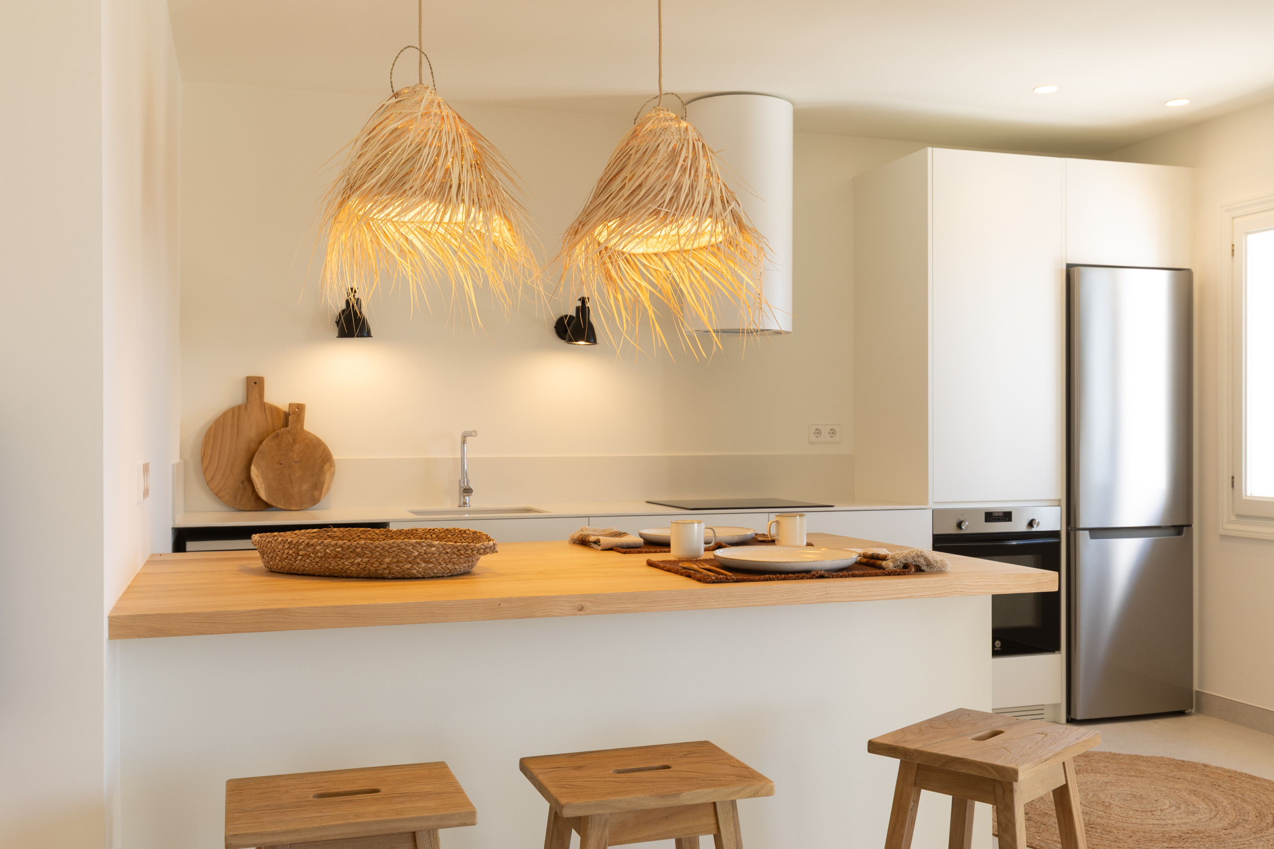 Open kitchen with a modern style island, fully equipped with dishwasher, microwave, fridge, ceramic hob, kettle, toaster, washing machine.