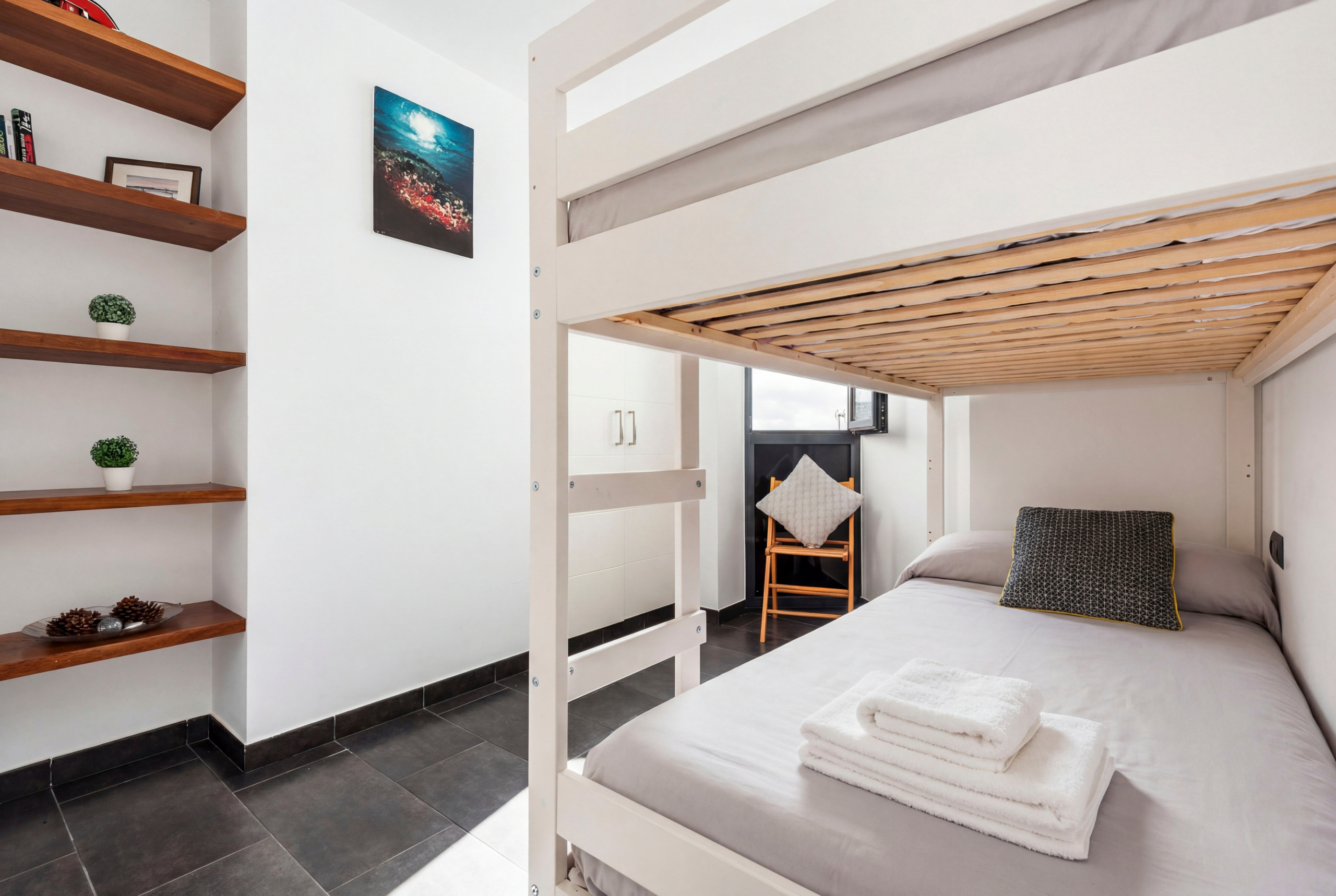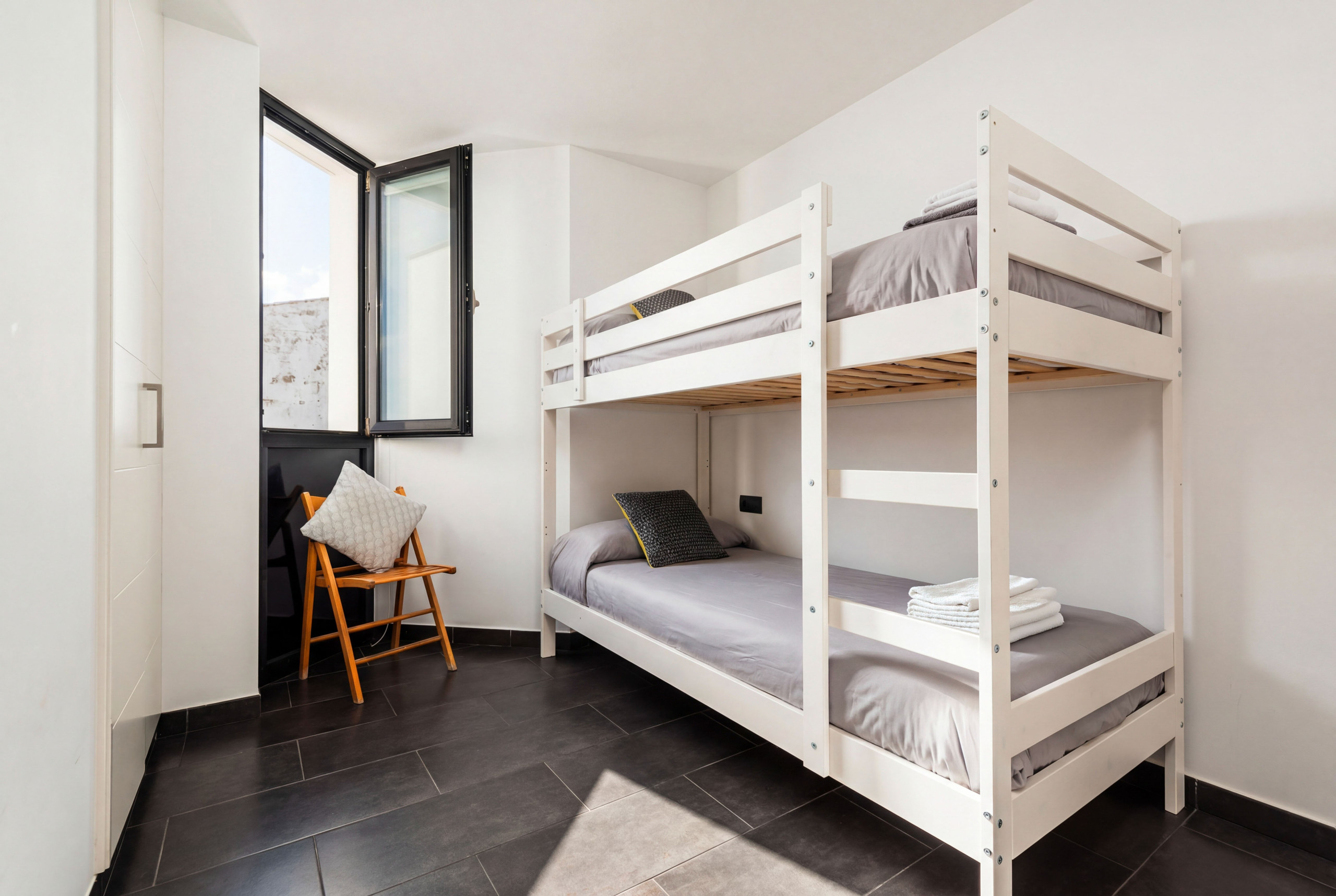 L'appartement dispose de deux chambres : une avec un lit double et l'autre avec un lit superposé, offrant des options de repos polyvalentes pour différents types de clients. Il se distingue par son équipement intérieur, qui comprend une connexion WiFi, la climatisation dans le salon, et une cuisine complètement indépendante et fonctionnelle. La cuisine est entièrement équipée avec des appareils électroménagers tels que réfrigérateur, machine à laver, four, micro-ondes, cafetière, grille-pain, et une vaisselle complète.