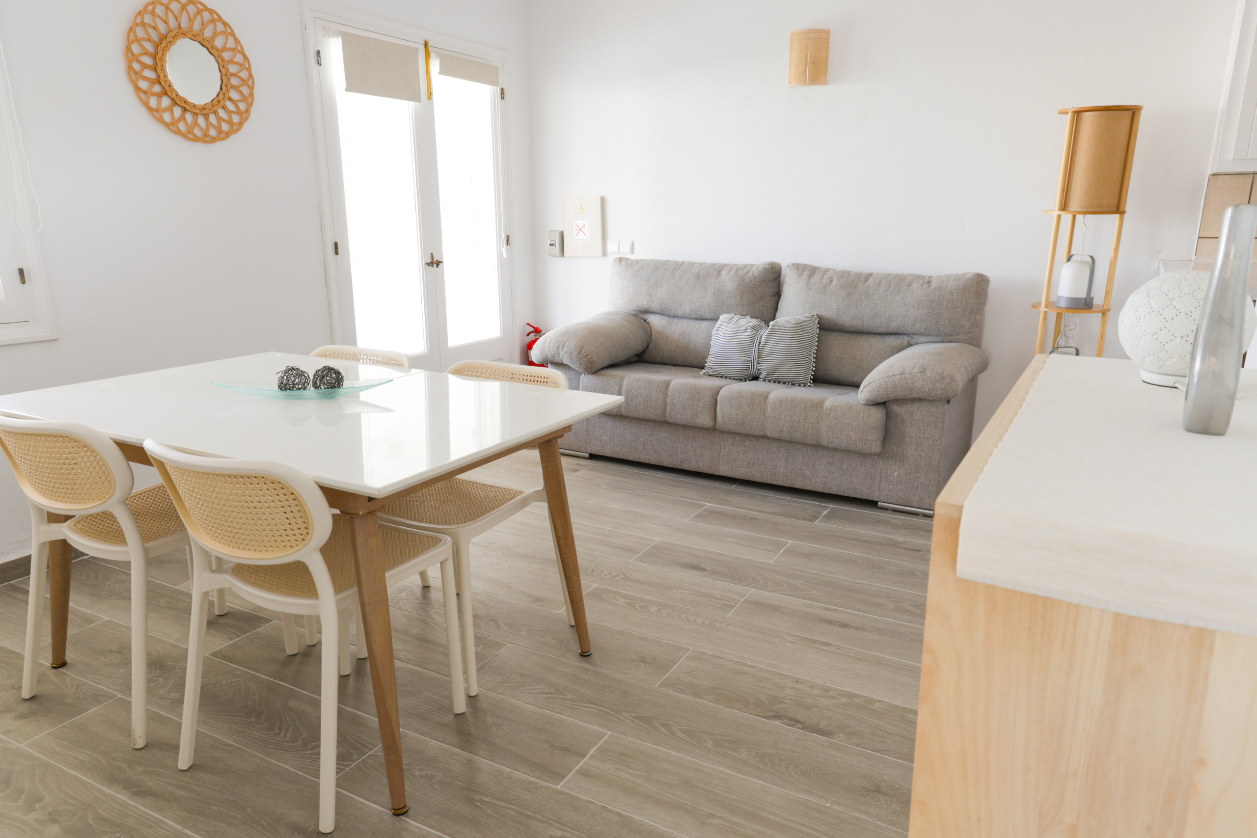 Il se compose d'un salon/salle à manger avec TV avec un grand canapé confortable et une table avec chaises pour 6 personnes.