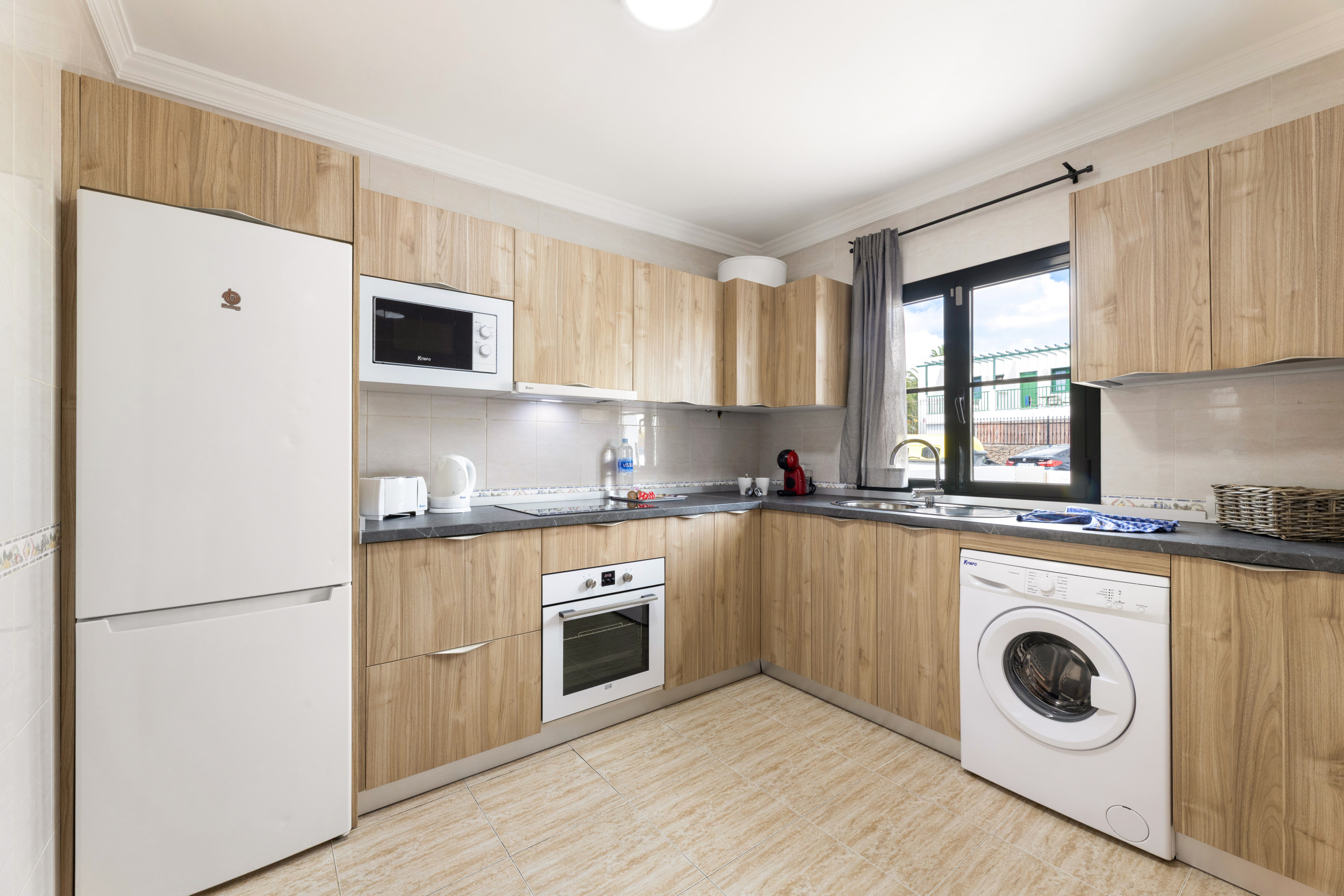 La cuisine, est équipée avec réfrigérateur, micro-ondes, four, congélateur, vaisselle/couverts, ustensiles/cuisine, cafetière, grille pain, bouilloire et presse-agrumes.