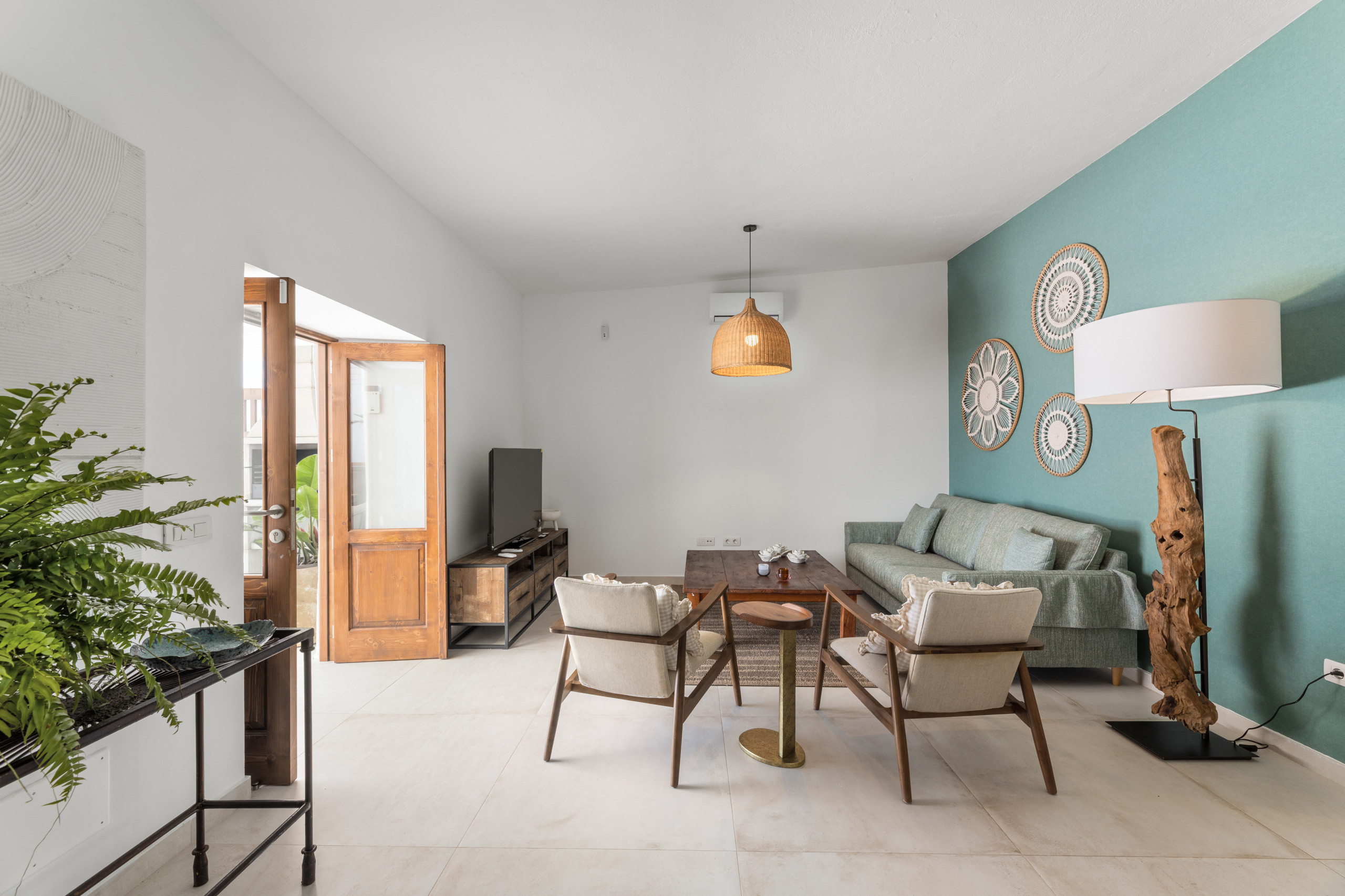Le salon dispose d'un canapé confortable, d'une télévision à écran plat et d'un accès à la terrasse extérieure avec table et chaises, piscine et transats pour se détendre au soleil ou lire un livre tranquillement.