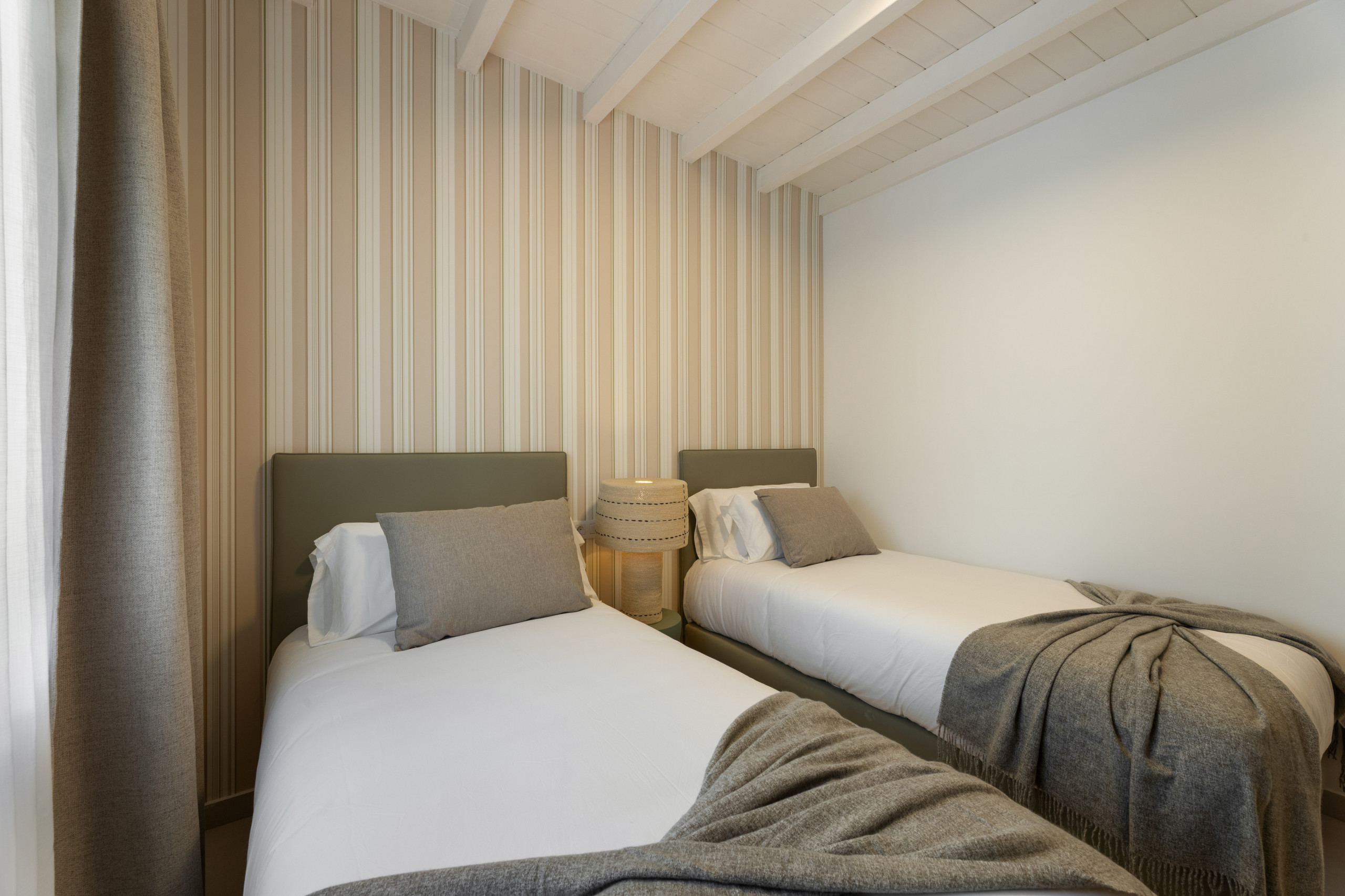 Elle comprend deux chambres spacieuses, l'une avec un lit de couple et l'autre avec deux lits individuels, deux salles de bains (dont une en suite), de grands placards intégrés, une décoration sereine et élégante.