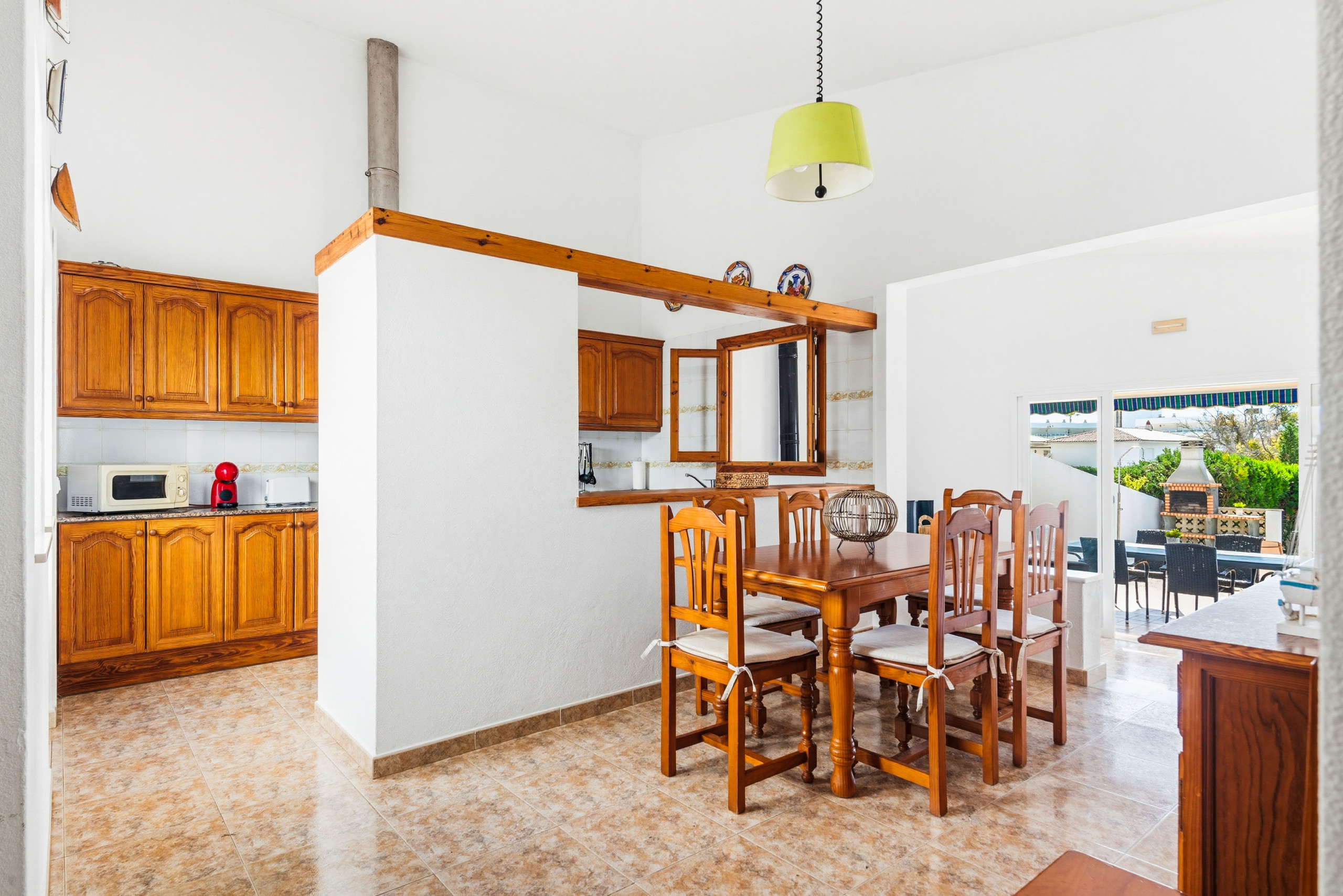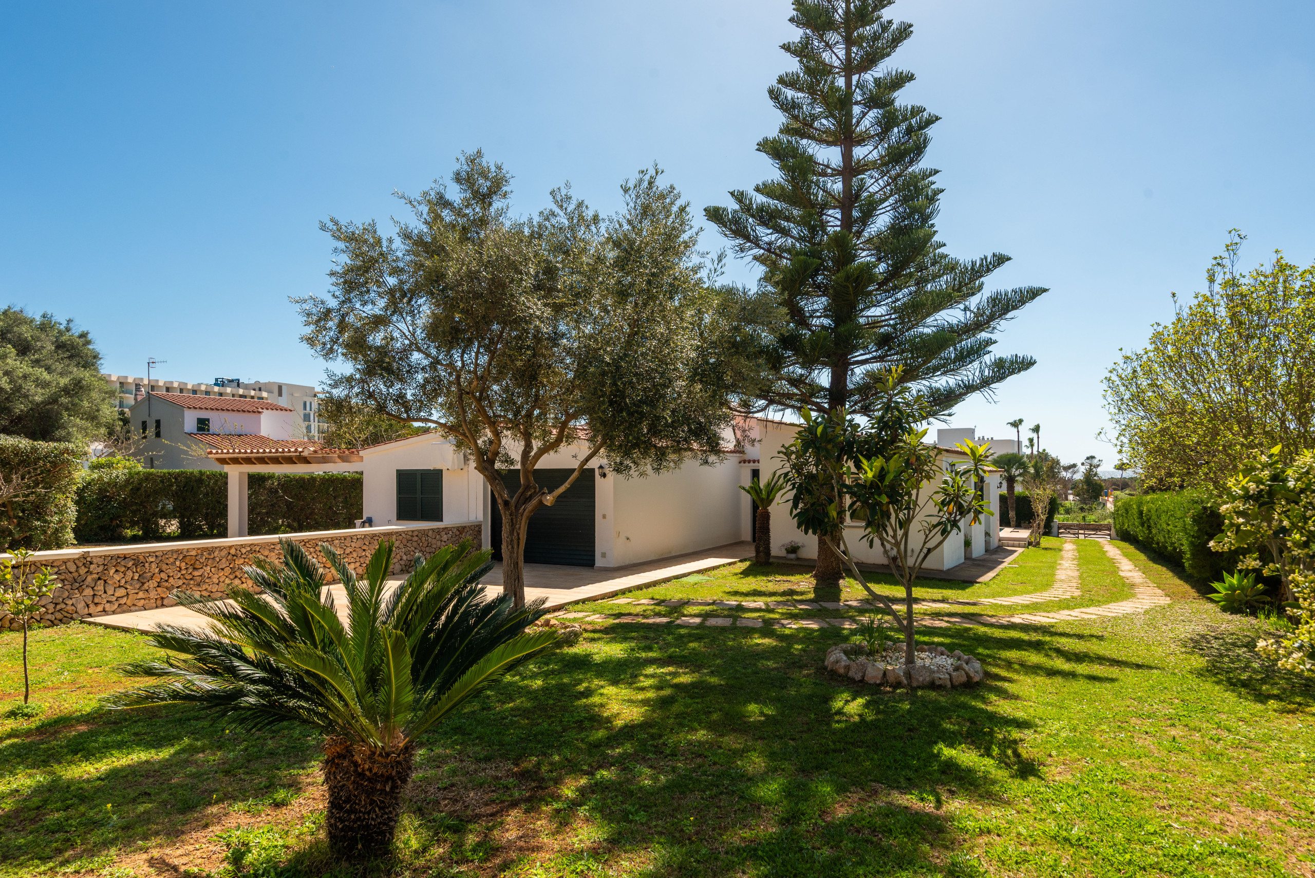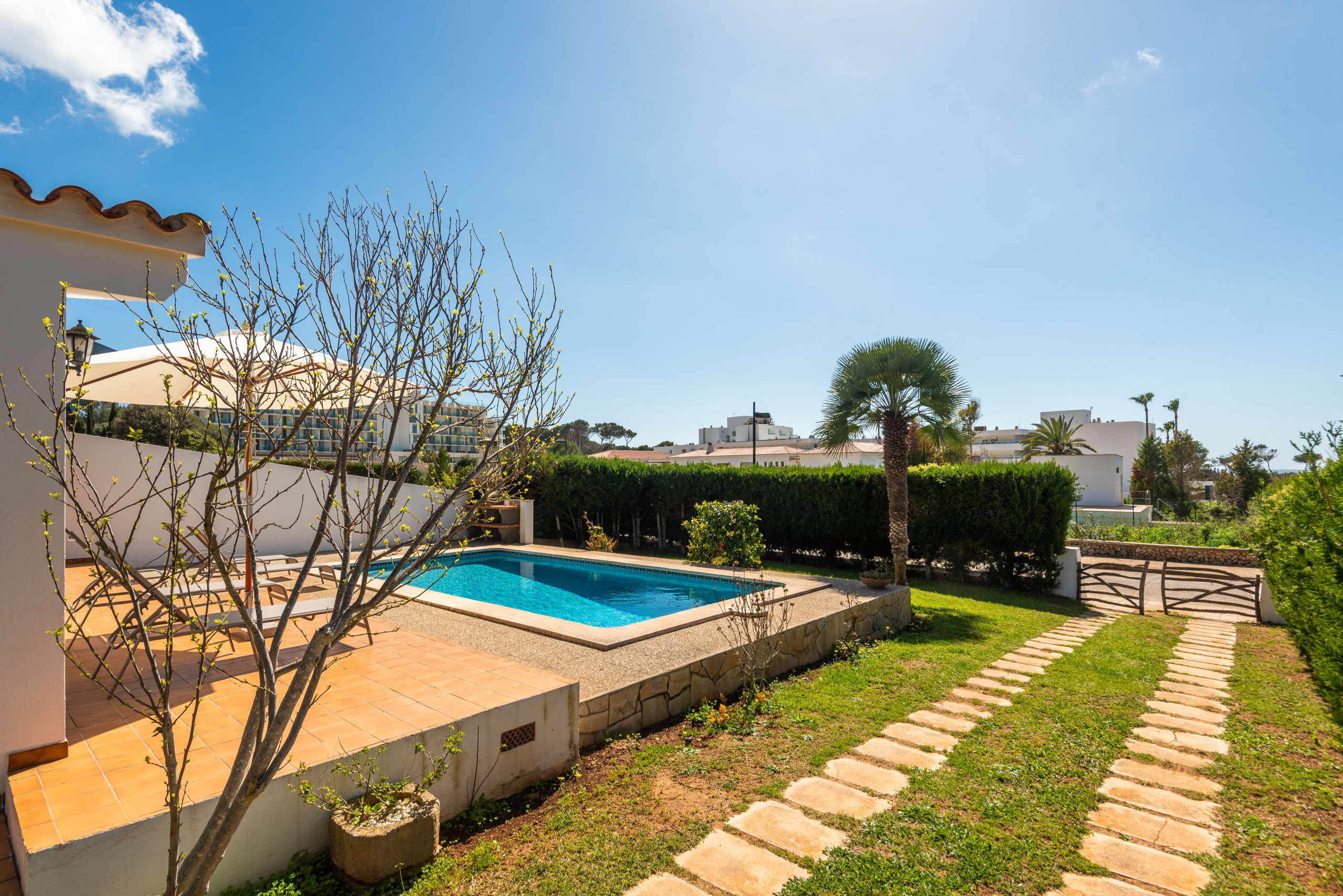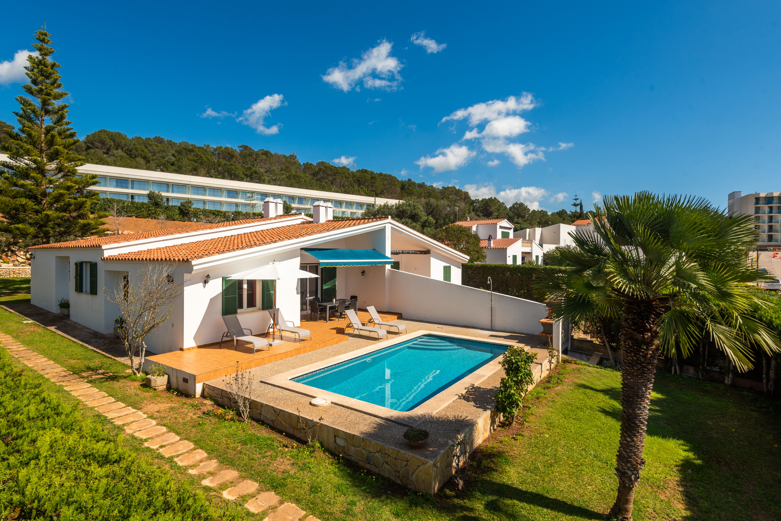 La villa se distingue par sa spaciosité et sa luminosité, avec une salle à manger circulaire originale qui apporte une touche spéciale à l'intérieur. À l'extérieur, elle offre un grand jardin privé avec la piscine située à l'arrière, garantissant le calme et la confidentialité, ainsi qu'un barbecue en maçonnerie, parfait pour profiter de repas en plein air.