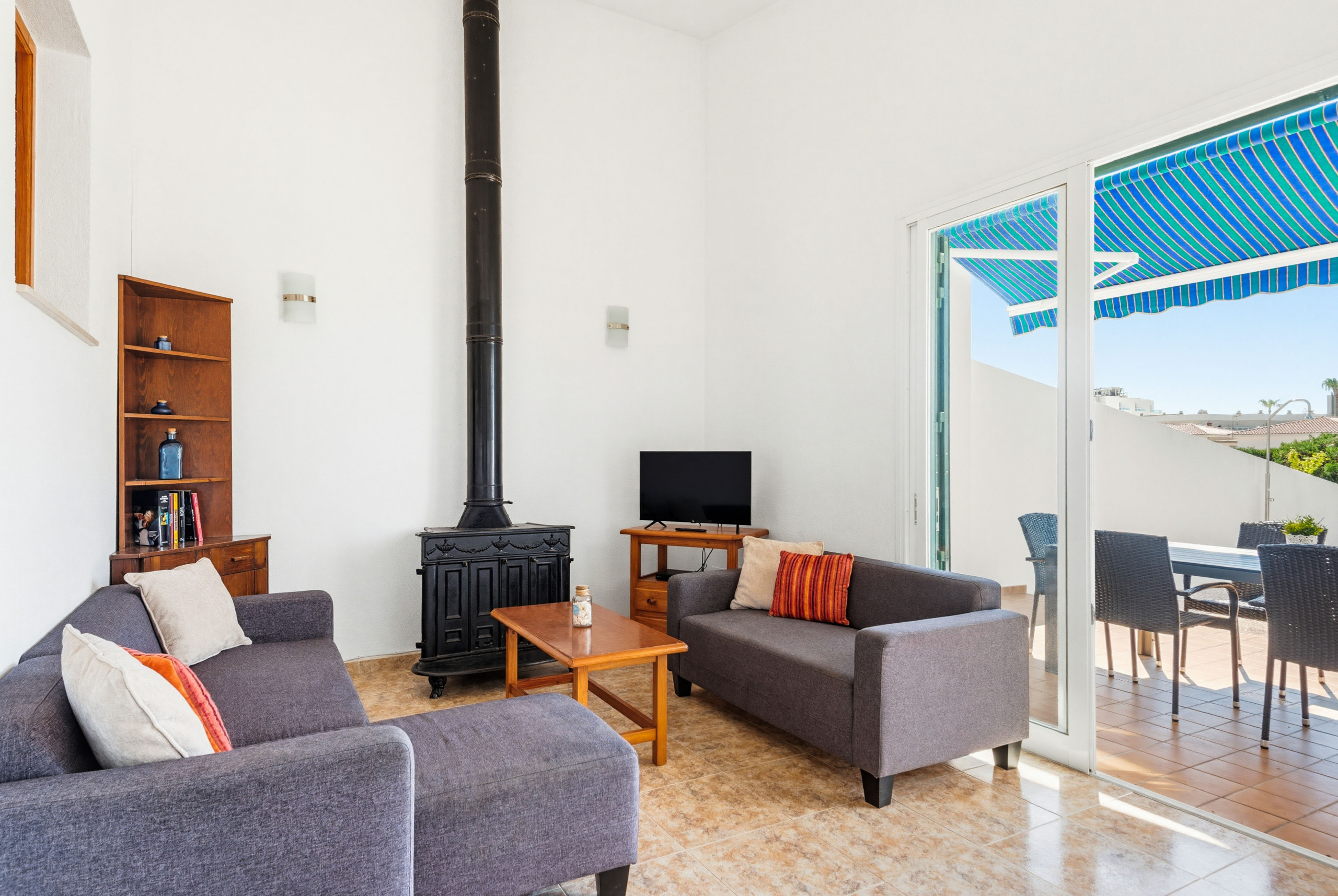 Villa mitoyenne à Santo Tomas, avec 3 chambres doubles, dont une avec un lit de matrimonial et les deux autres avec 2 lits individuels chacune, placards intégrés avec ventilateurs de plafond. La villa comprend deux salles de bains, toutes deux avec baignoire. Grande cuisine ouverte avec bar américain bien équipée selon l'inventaire. Avec lave-vaisselle et machine à laver.