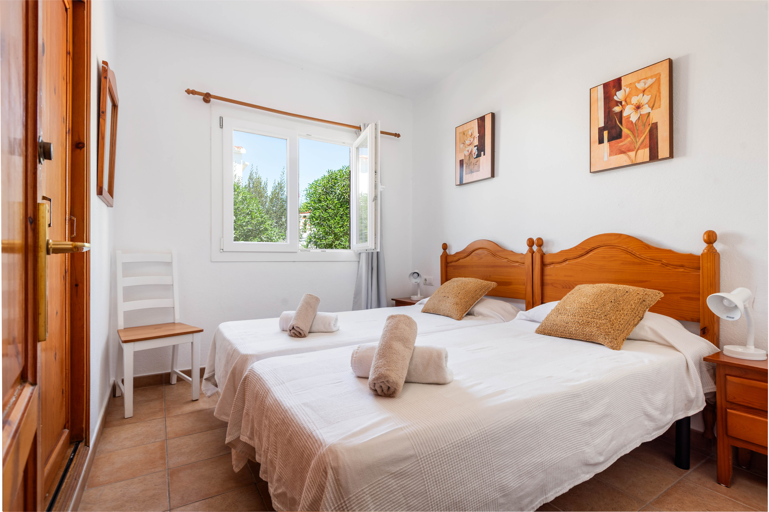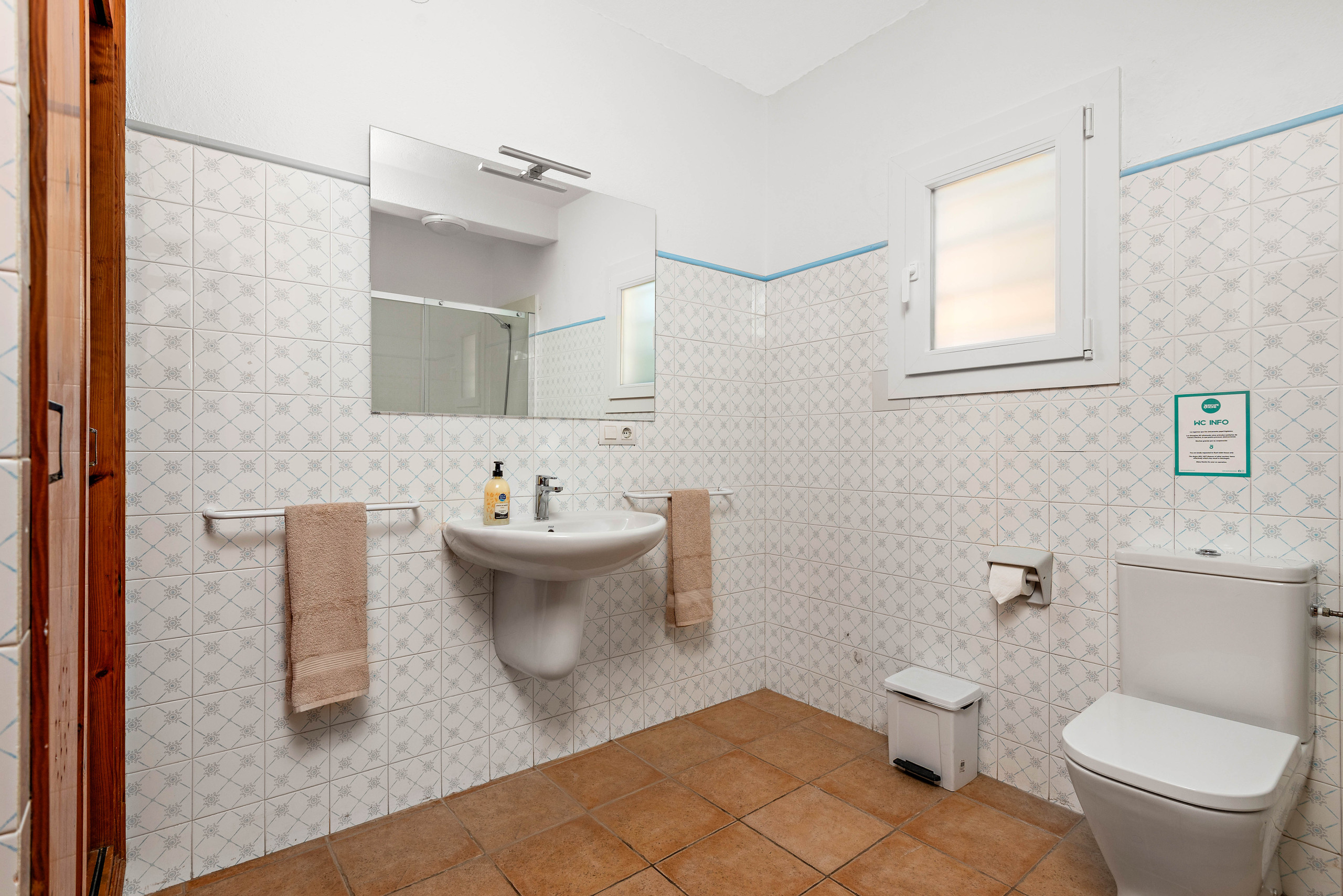Au même étage, il y a des toilettes et une terrasse qui offre une vue magnifique sur la plage de Son Bou. En descendant les escaliers, vous accédez à l'étage inférieur, où se trouvent les quatre chambres doubles. L'une a un lit double, la climatisation avec une horloge et une salle de bain attenante. Les trois autres chambres sont équipées de lits simples, de ventilateurs et partagent une salle de bain complète.