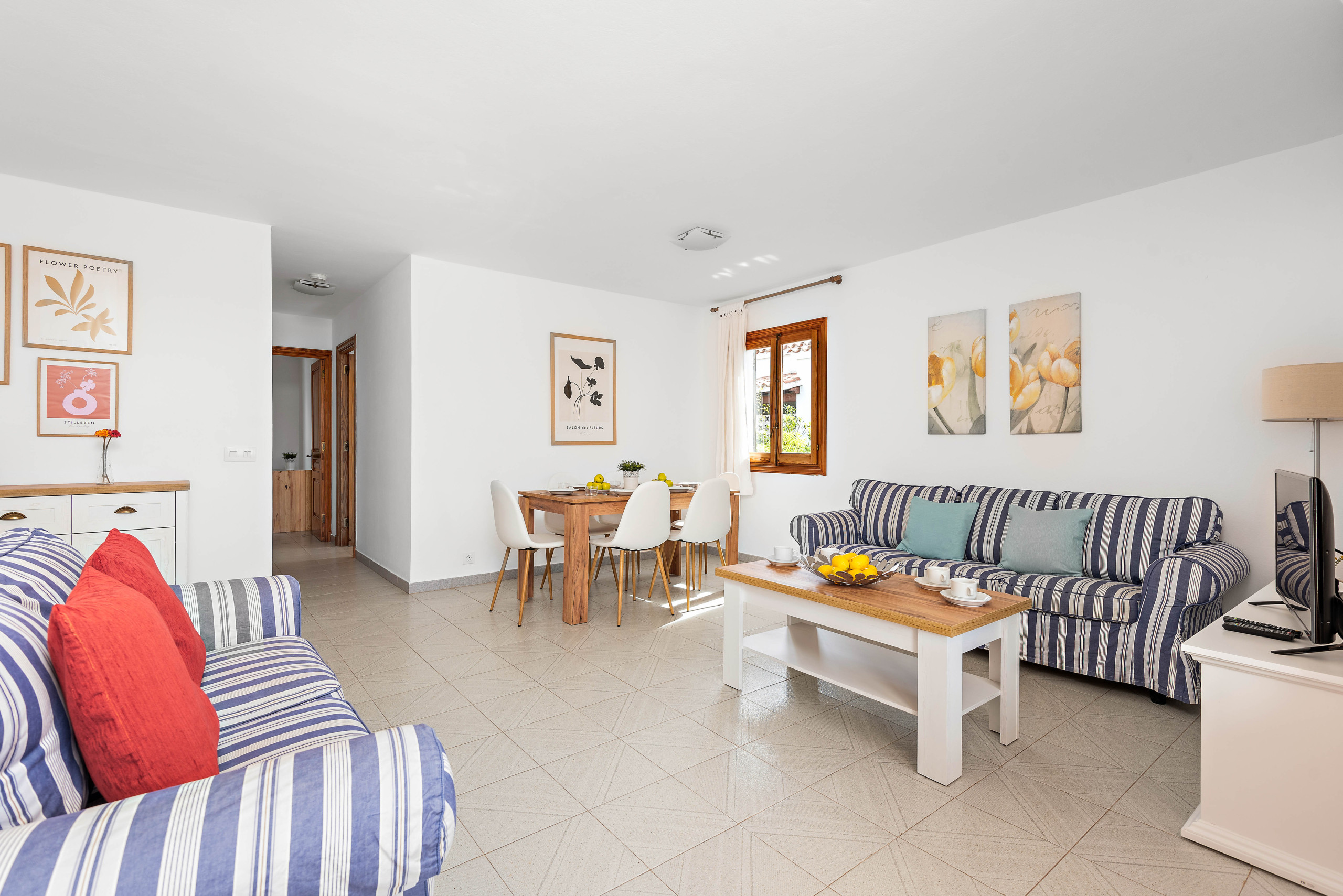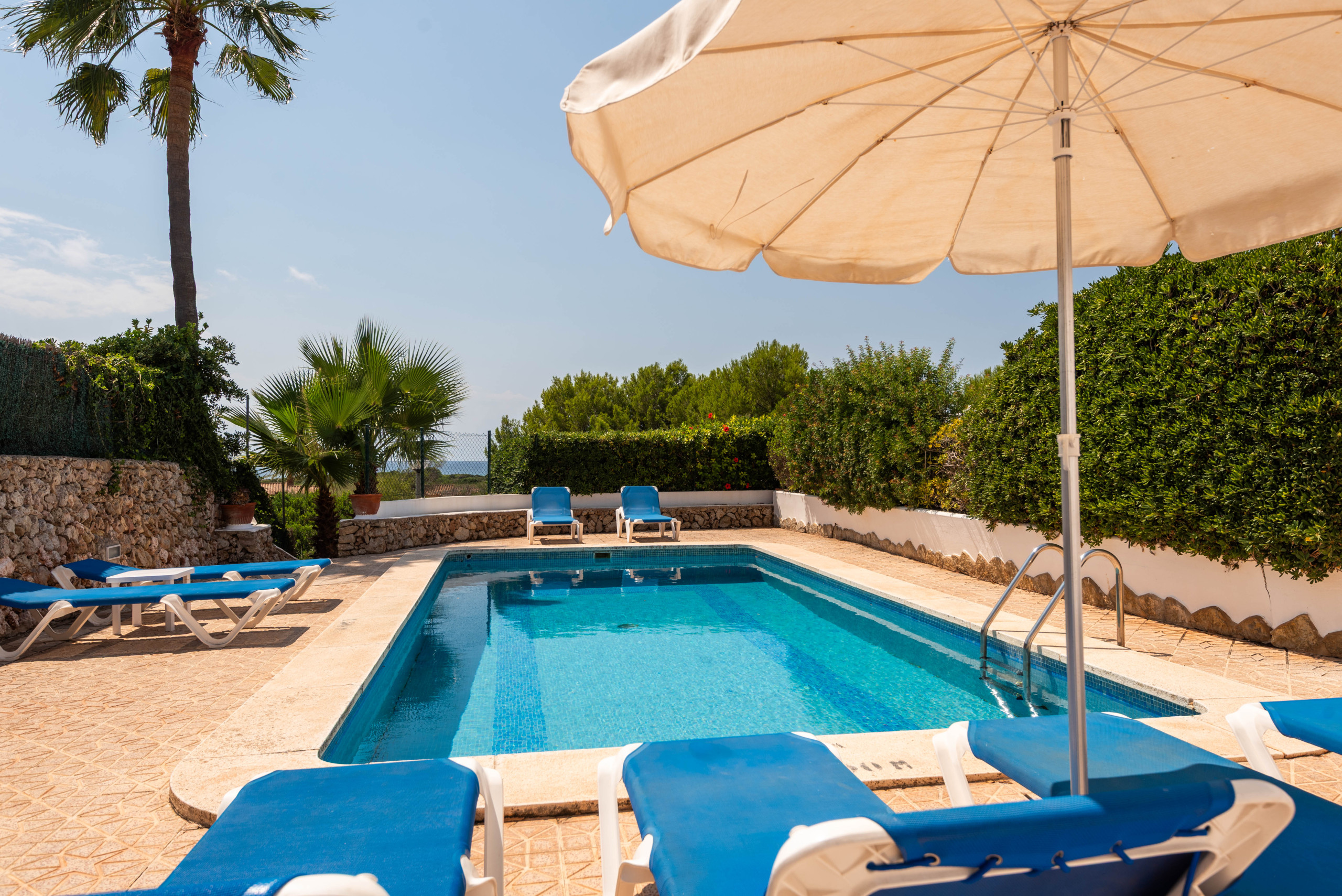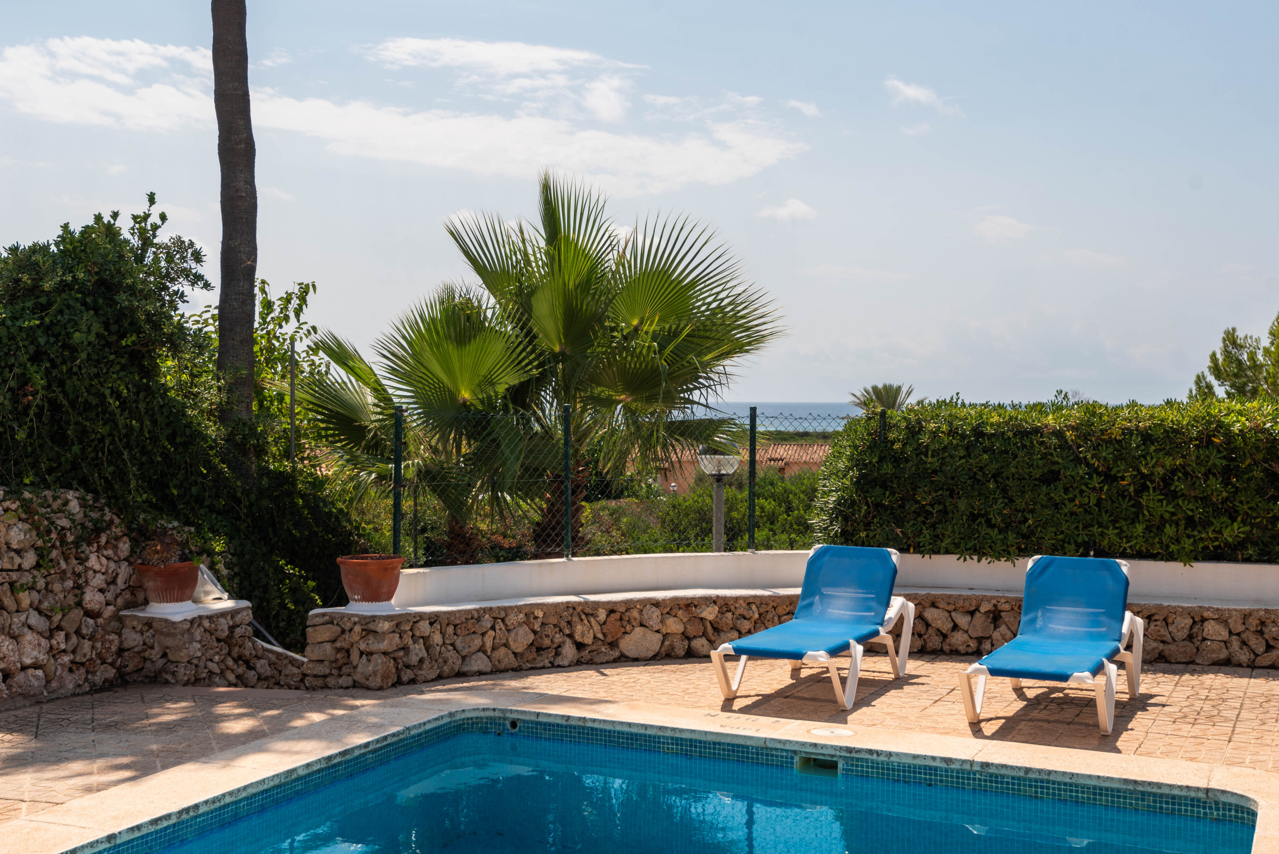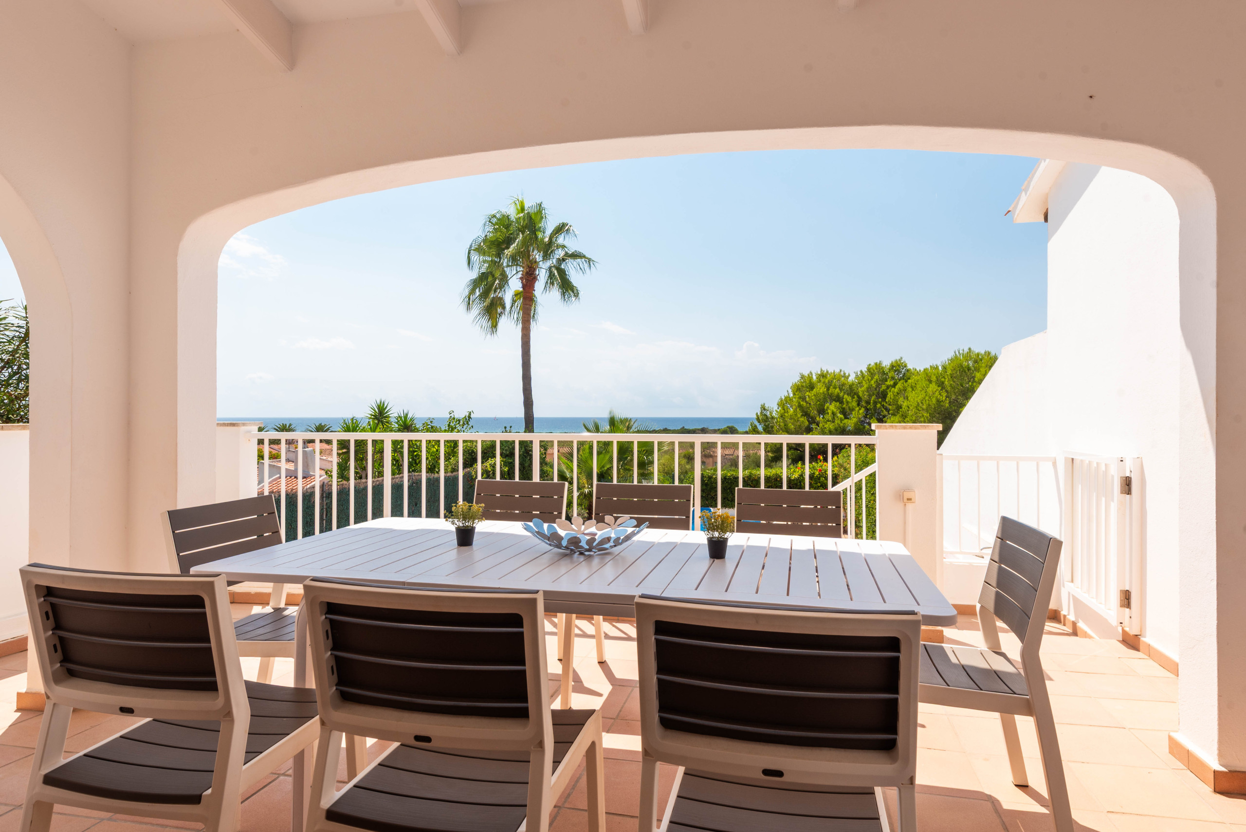 Cette jolie maison mitoyenne de deux étages avec piscine privée et vue imprenable sur la mer et la plage de Son Bou est située dans la résidence Torre Solí Nou. À l'étage supérieur se trouve la zone commune du salon-salle à manger climatisée, une cuisine entièrement équipée, une salle de bain, une chambre double et la buanderie extérieure. Il y a aussi la terrasse couverte avec une zone barbecue, avec une vue magnifique sur la mer.