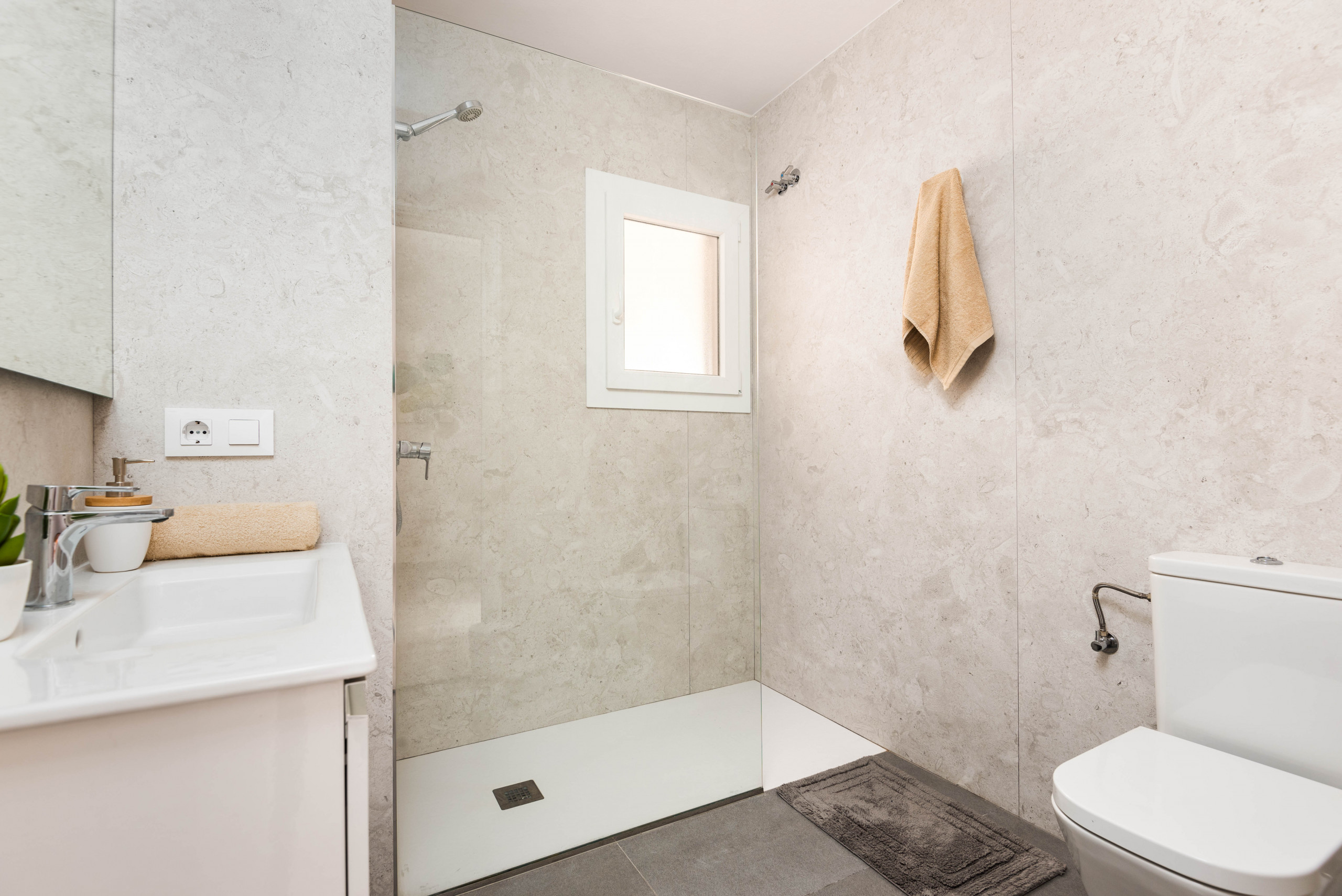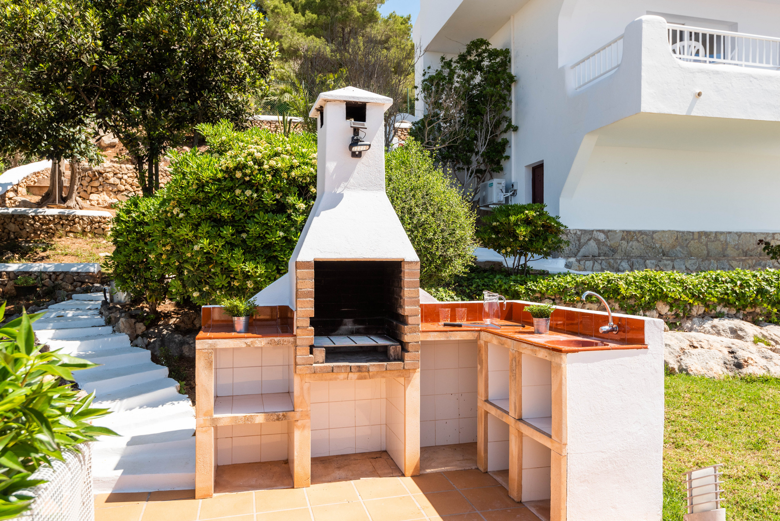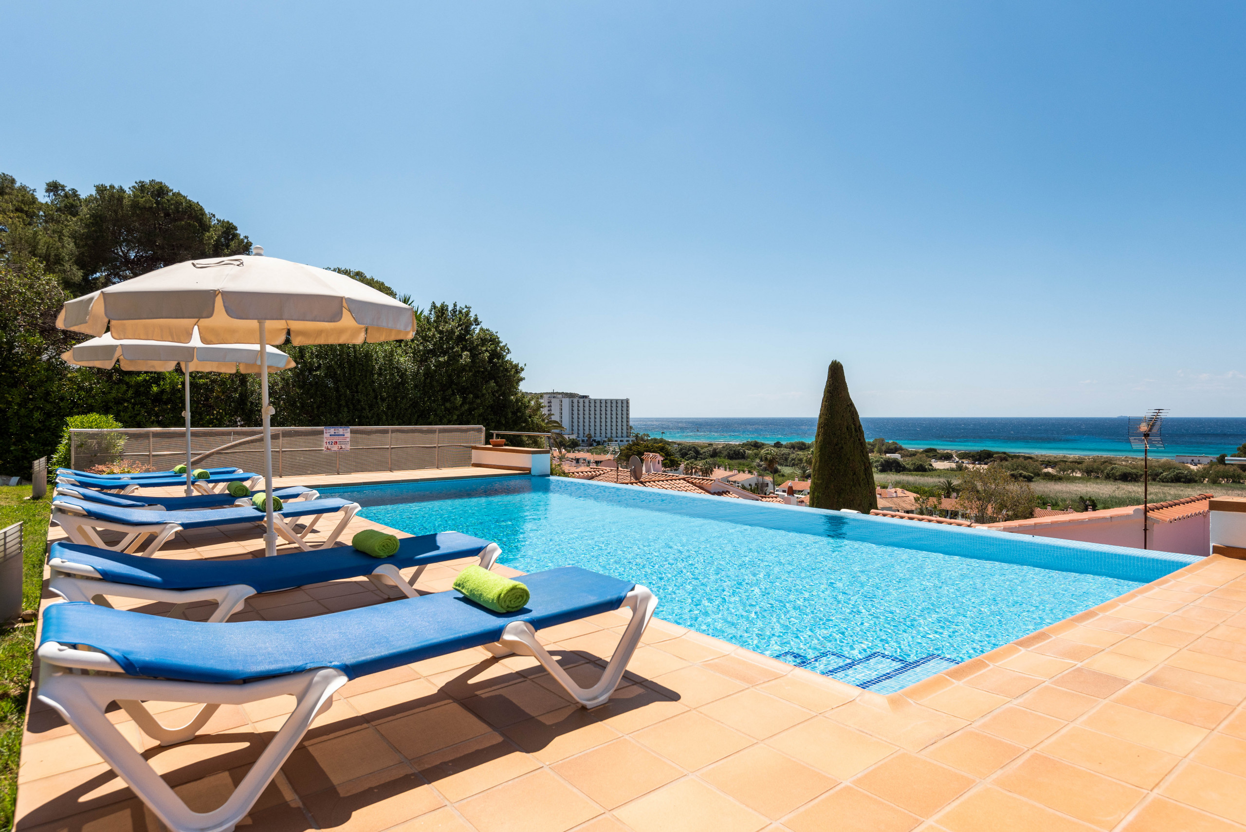 La terrasse offre une vue magnifique sur la plage de Son Bou. En descendant les escaliers de la villa, vous accédez à l'étage inférieur, où vous trouverez les 3 chambres doubles, dont une avec un lit double. Deux des chambres ont accès à la terrasse et à la piscine, qui dispose également d'un espace barbecue et d'un grand solarium avec transats pour profiter du soleil. L'ensemble du terrain est entouré d'un jardin.