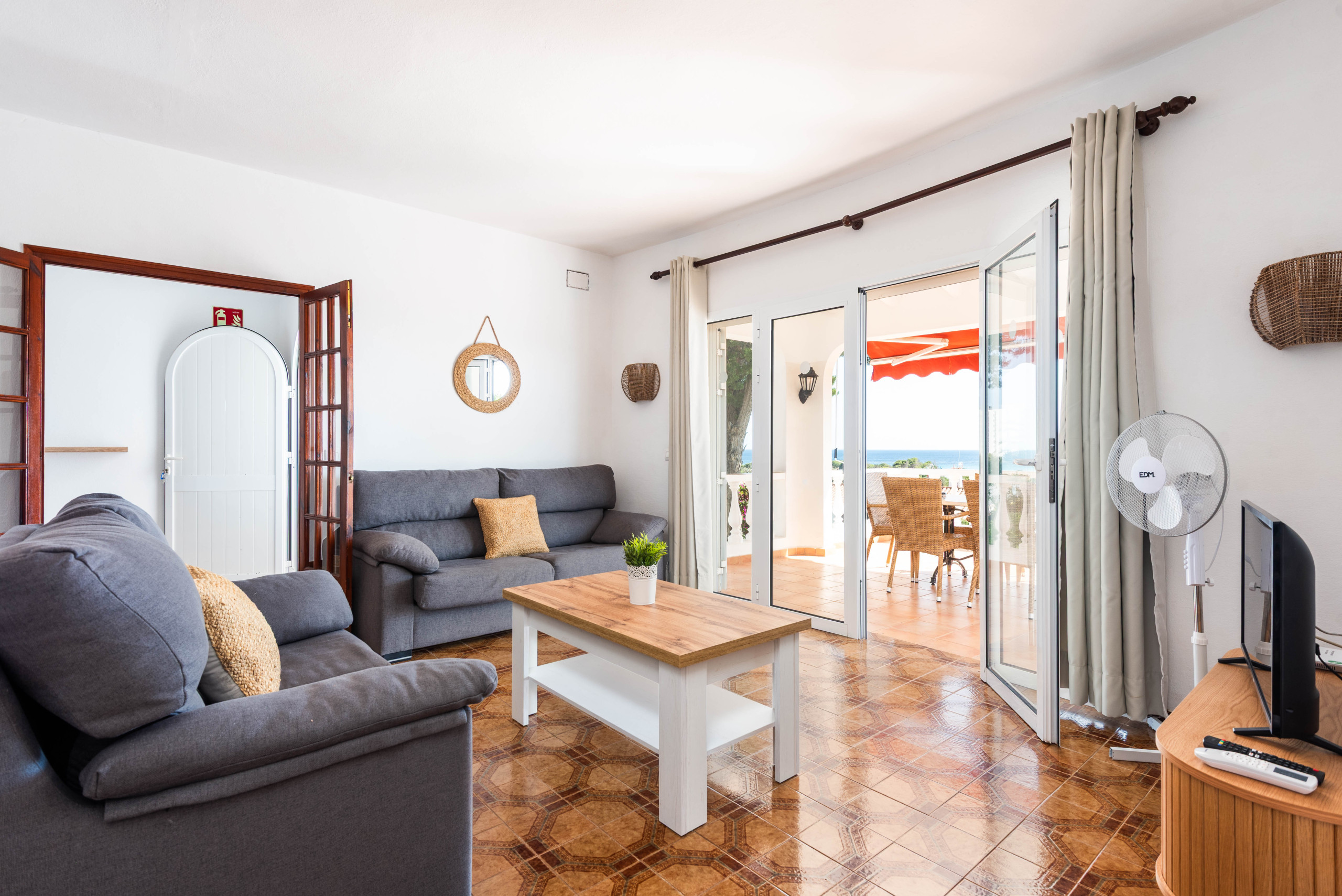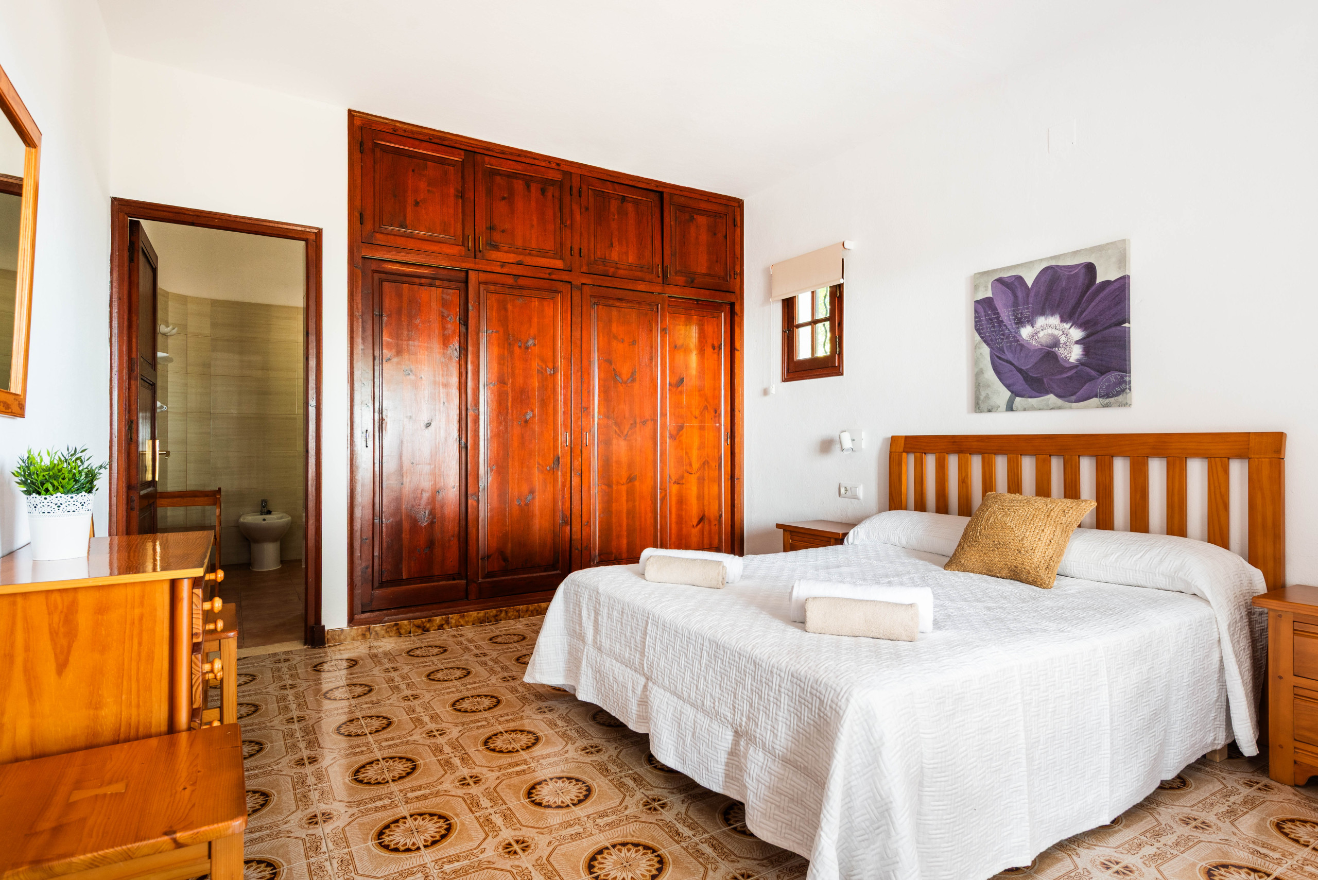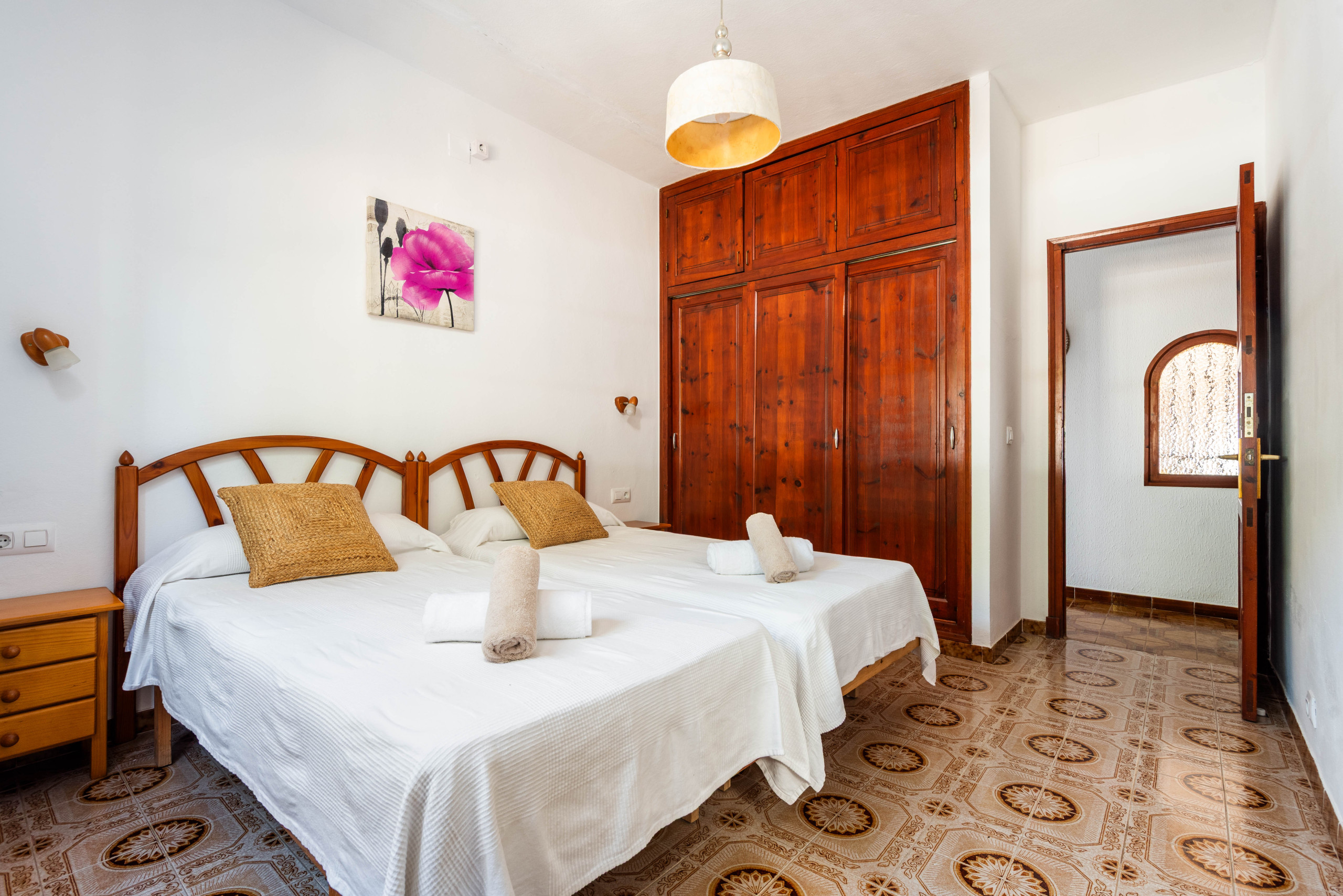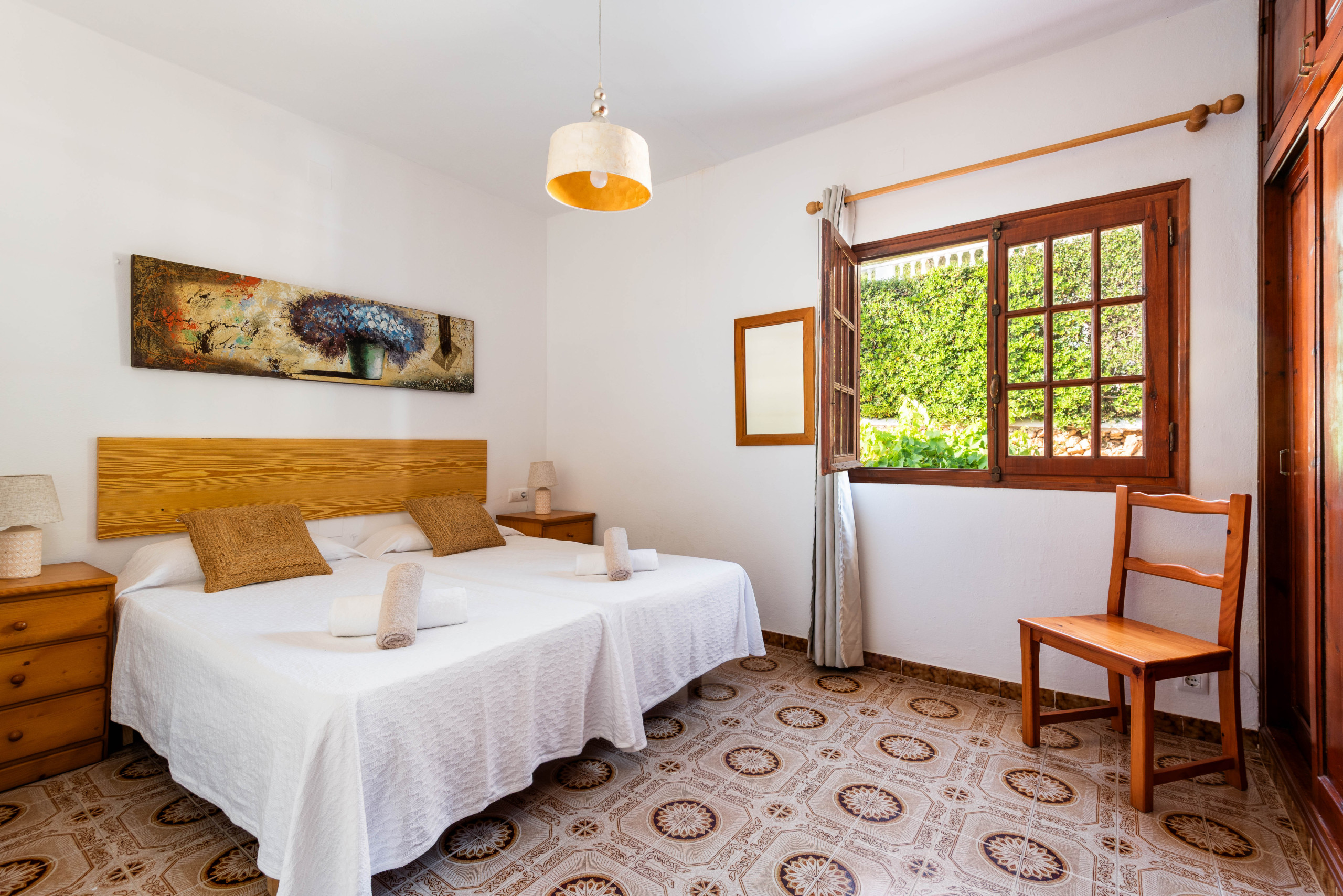 La villa dispose de trois chambres, l'une avec un lit double, la climatisation et l'accès à la terrasse avec vue, et les deux autres chambres avec des lits simples et des ventilateurs de plafond. 2 salles de bain partagées, une avec baignoire et l'autre avec douche. Grande terrasse couverte avec mobilier de jardin pour profiter des couchers de soleil. Grande piscine et un espace confortable pour profiter d'un barbecue.