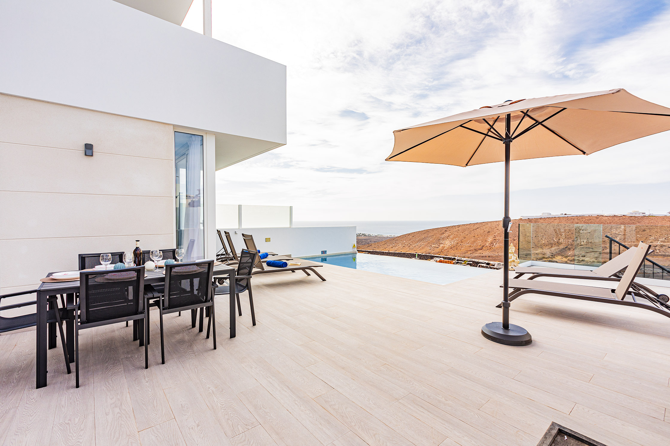 Villa à Tías qui possède 3 chambre(s) et Capacité pour 6 personnes. Logement de 114 m², avec vue sur la mer et la montagne. La location se trouve à 0 m de l'hôpital, 1 km de la cafétéria "San Antonio Panificadora", 1 km du restaurant "El Manduco", 1 km du restaurant "La Ermita", 4 km de la plage de sable "Los Pocillos", 5 km de l'aéroport "Aeropuerto César Manrique-Lanzarote", 5 km de la plage de sable "Matagorda", 5 km de la plage de sable "Playa Grande Puerto del Carmen".Elle dispose de jardin, mobilier de jardin, clôture, terrasse, lave-linge, barbecue, coffre-fort, accès internet (wifi), sèche-cheveux, balcon, climatisation, piscine chauffée privée, parking extérieur même bâtiment, TV.La cuisine, est équipée avec réfrigérateur, micro-ondes, four, congélateur, lave-vaisselle, vaisselle/couverts, ustensiles/cuisine, cafetière, grille pain, bouilloire et presse-agrumes.