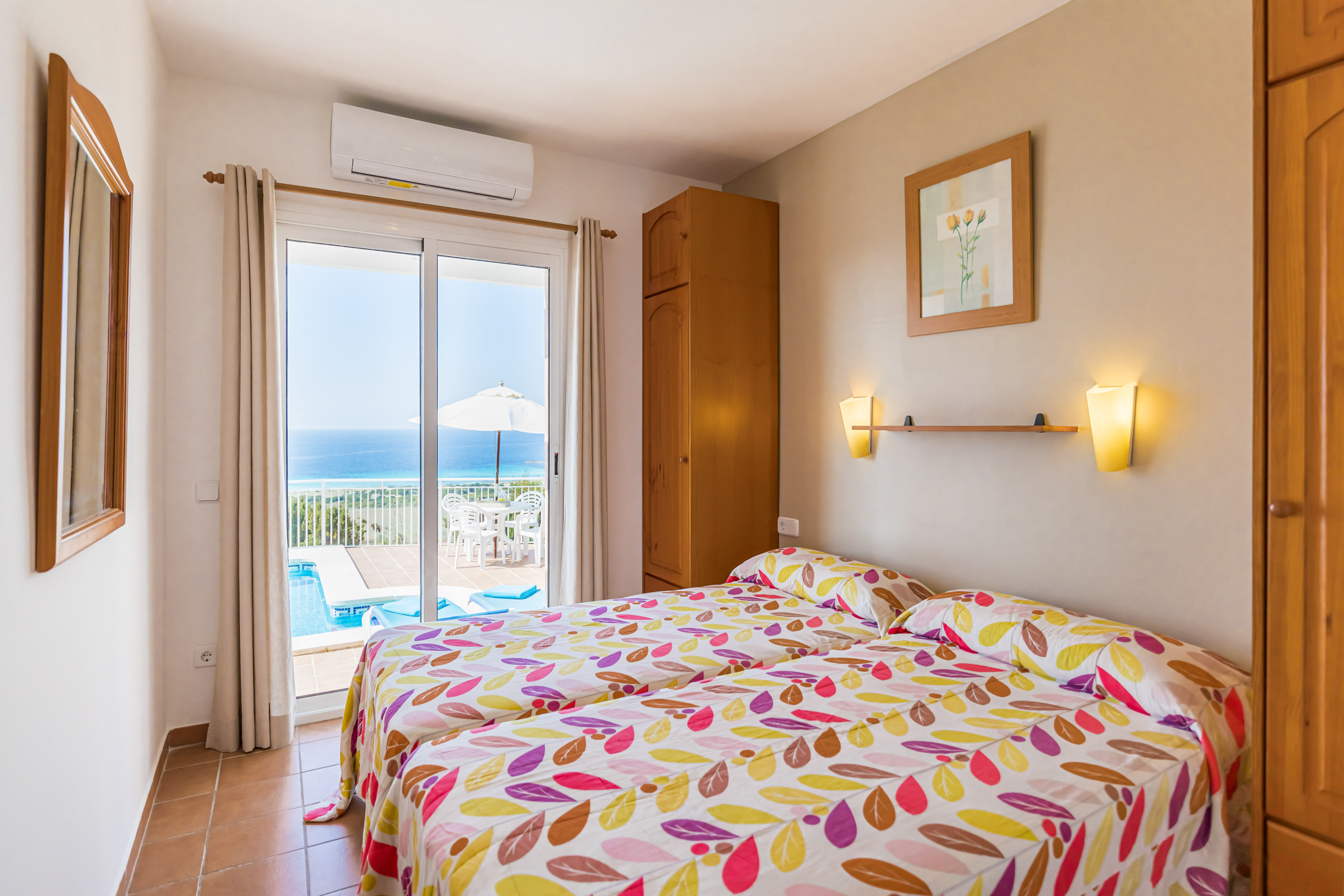 À l'étage inférieur se trouvent les zones de repos. La villa dispose de deux chambres avec deux lits individuels et une chambre avec un lit de matrimonial et une salle de bain attenante. Au même étage se trouve une autre salle de bain complète. Toutes les chambres ont un accès direct à la terrasse et à la piscine, et leurs grandes portes vitrées permettent l'entrée d'une abondante lumière naturelle, offrant des vues imprenables sur la mer et la plage.