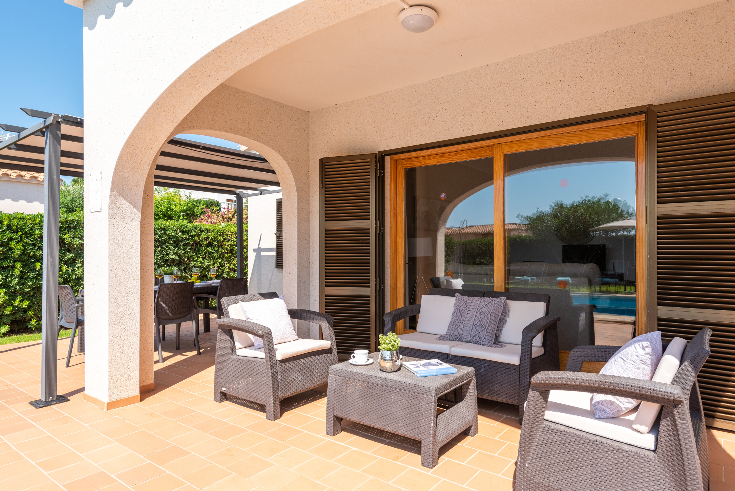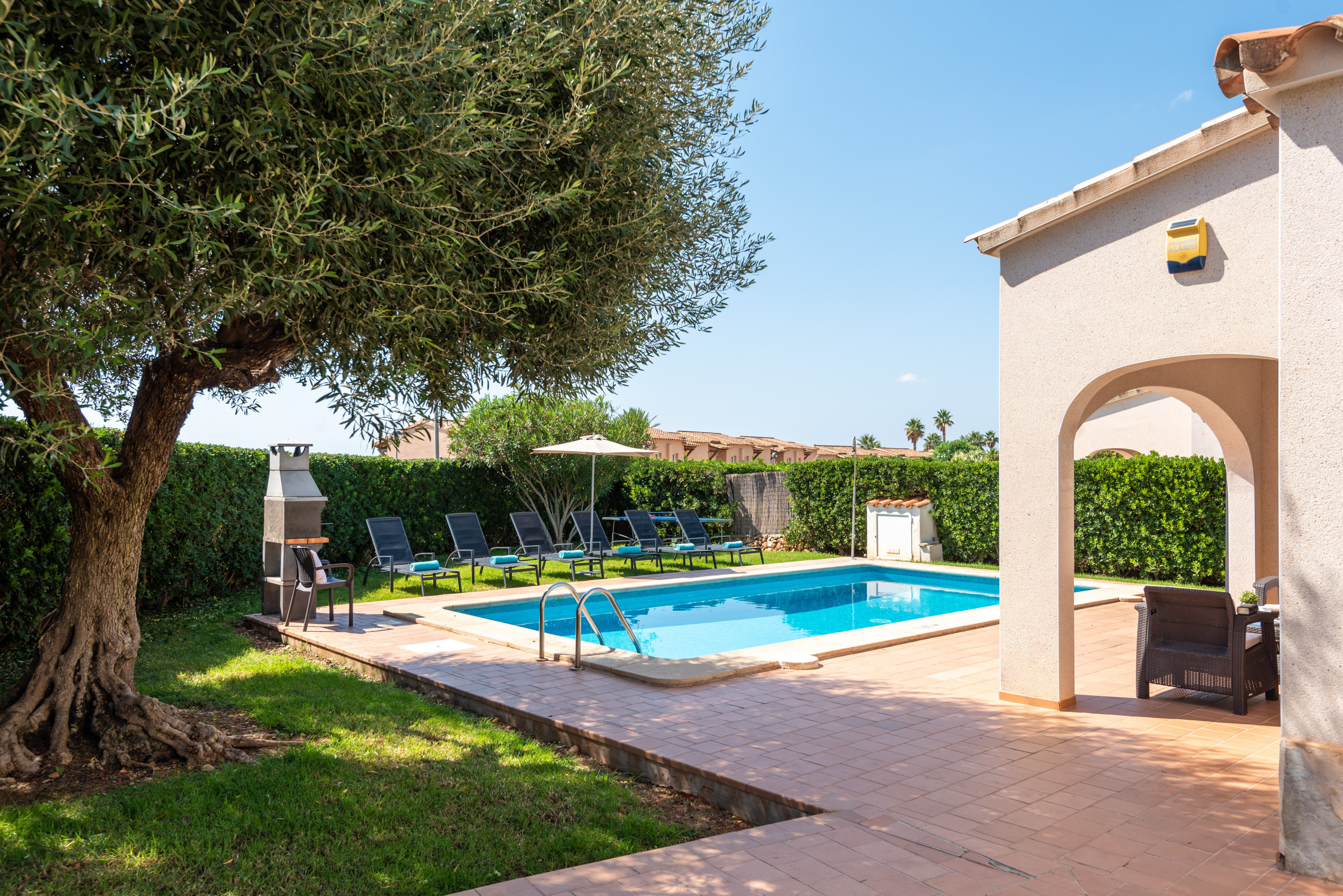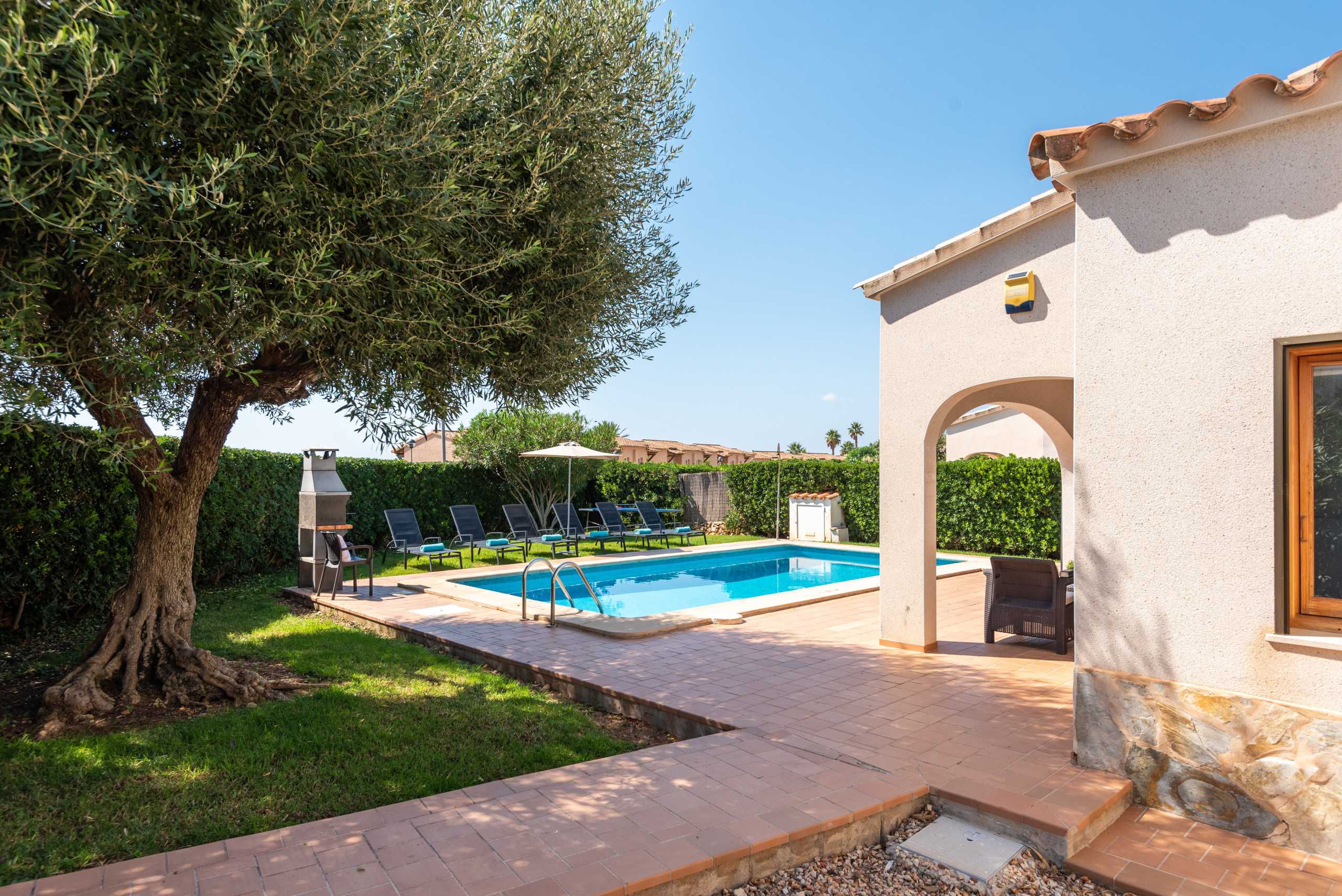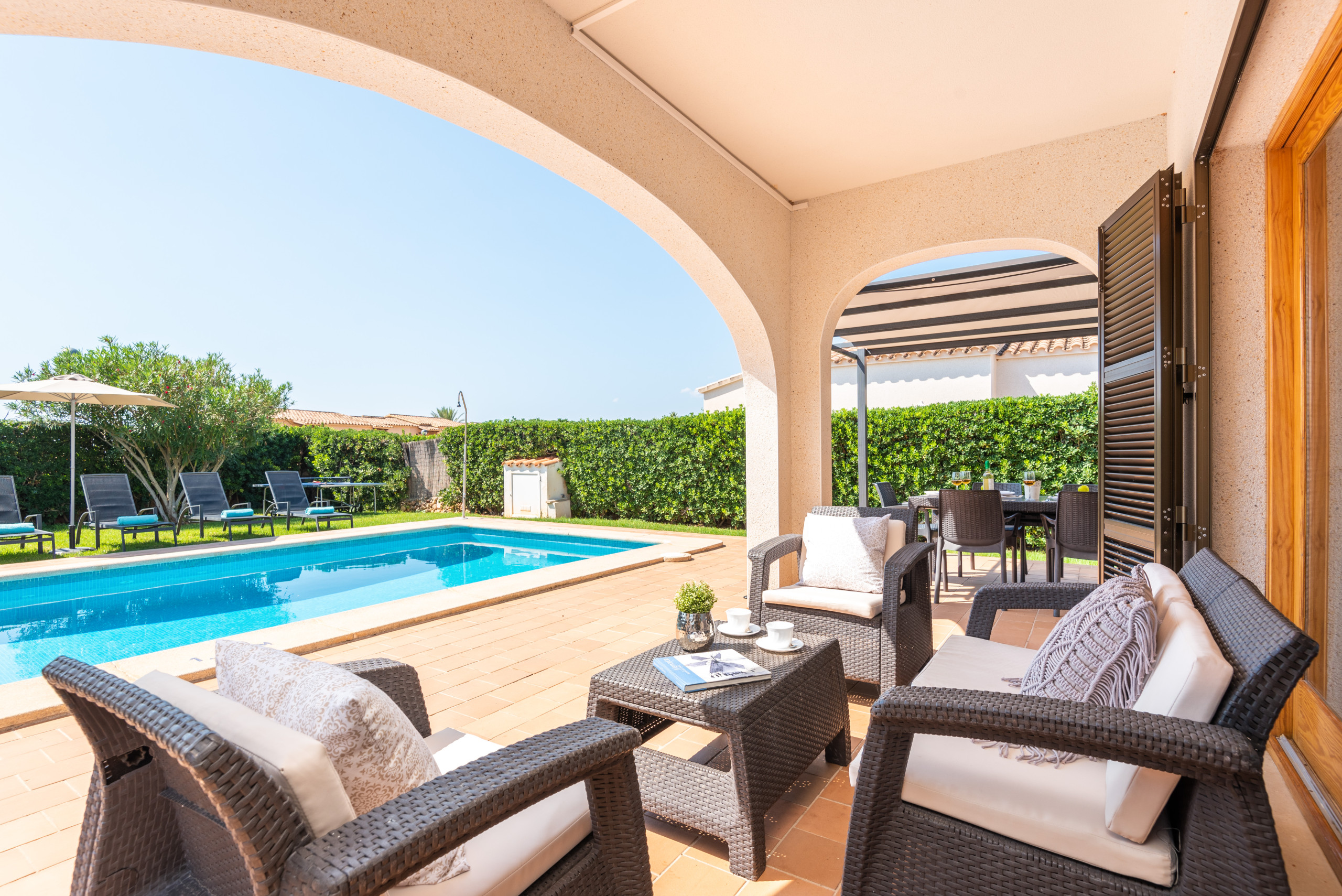 manger extérieure, sur les vastes jardins avec pelouse et sur la magnifique piscine privée.